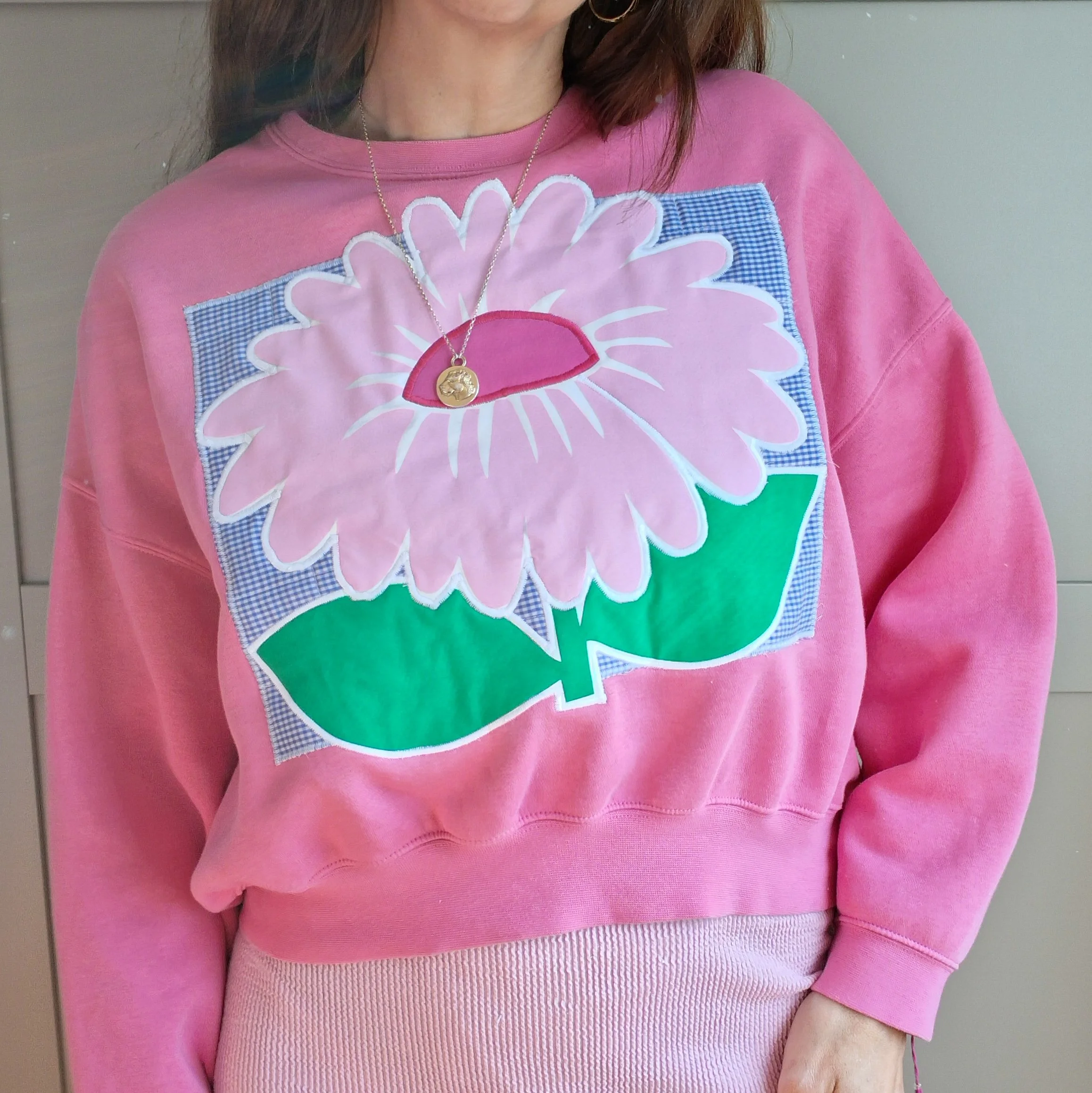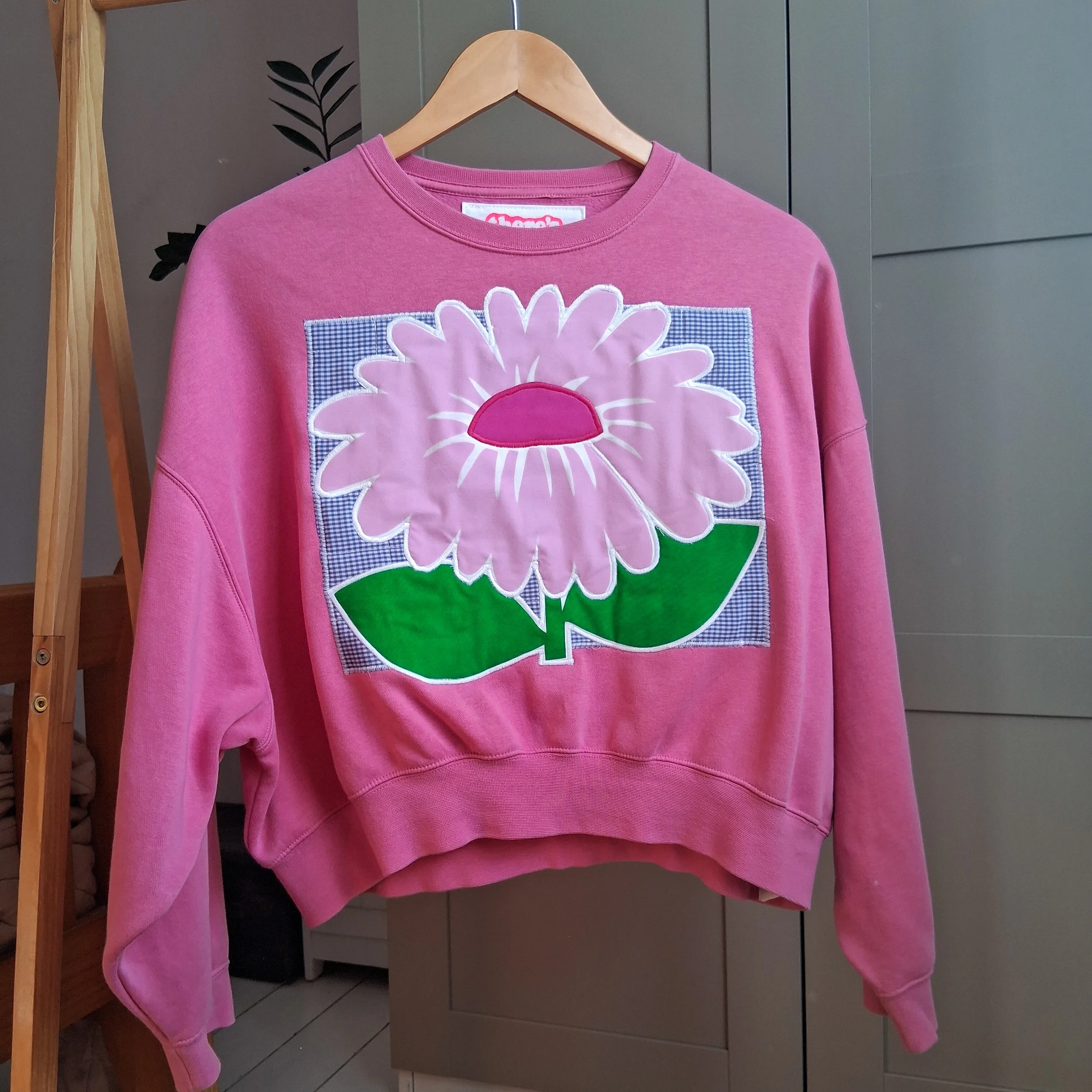 This reworked sweatshirt is a bright pink with balloon sleeves in a size M.