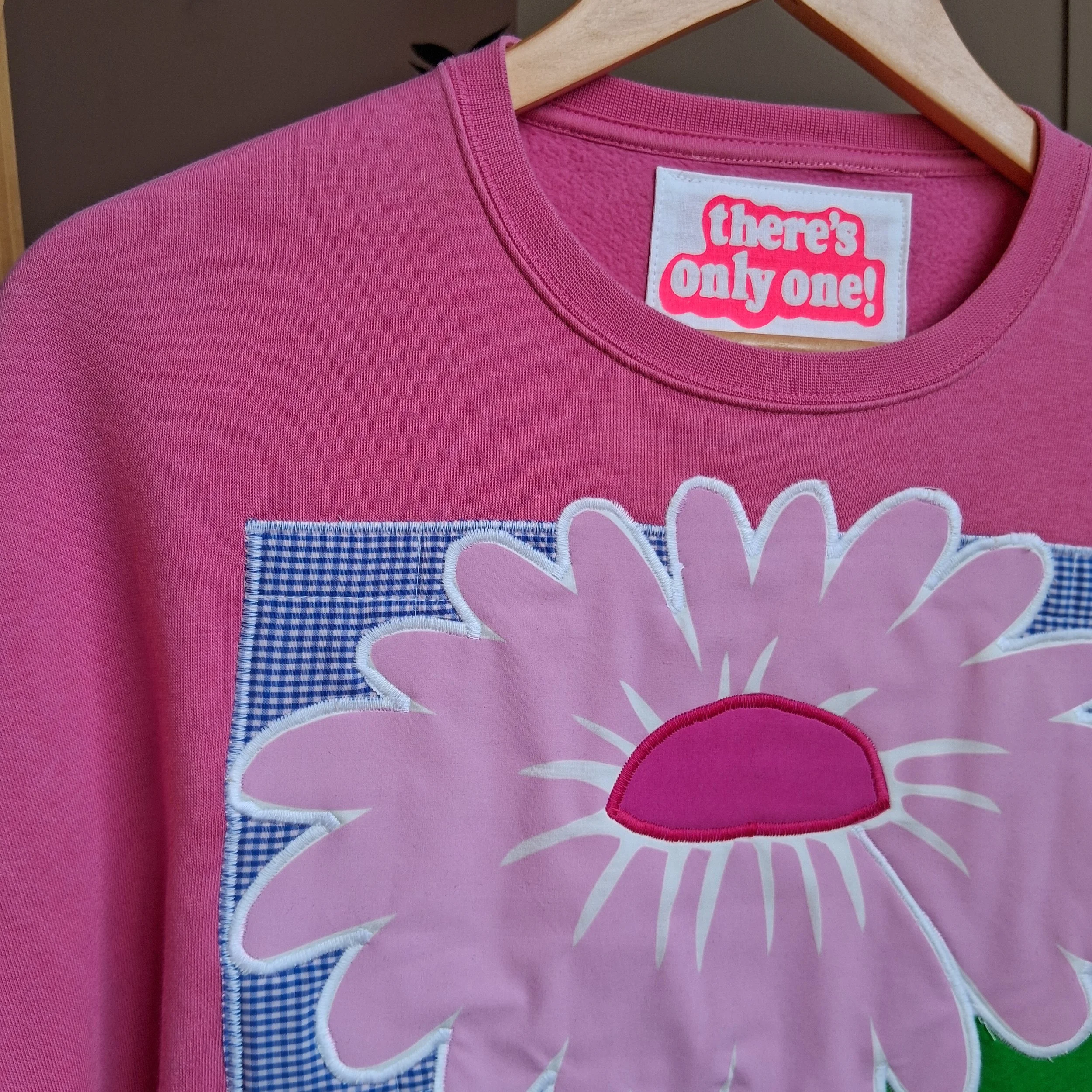 It has been reworked with hand screen printed designs appliqued on to it. The appliqued designs have been printed onto second hand cotton. Every design is one of a kind, the aim being to turn a fast fashion, unloved item into a garment to be cared for and looked after.