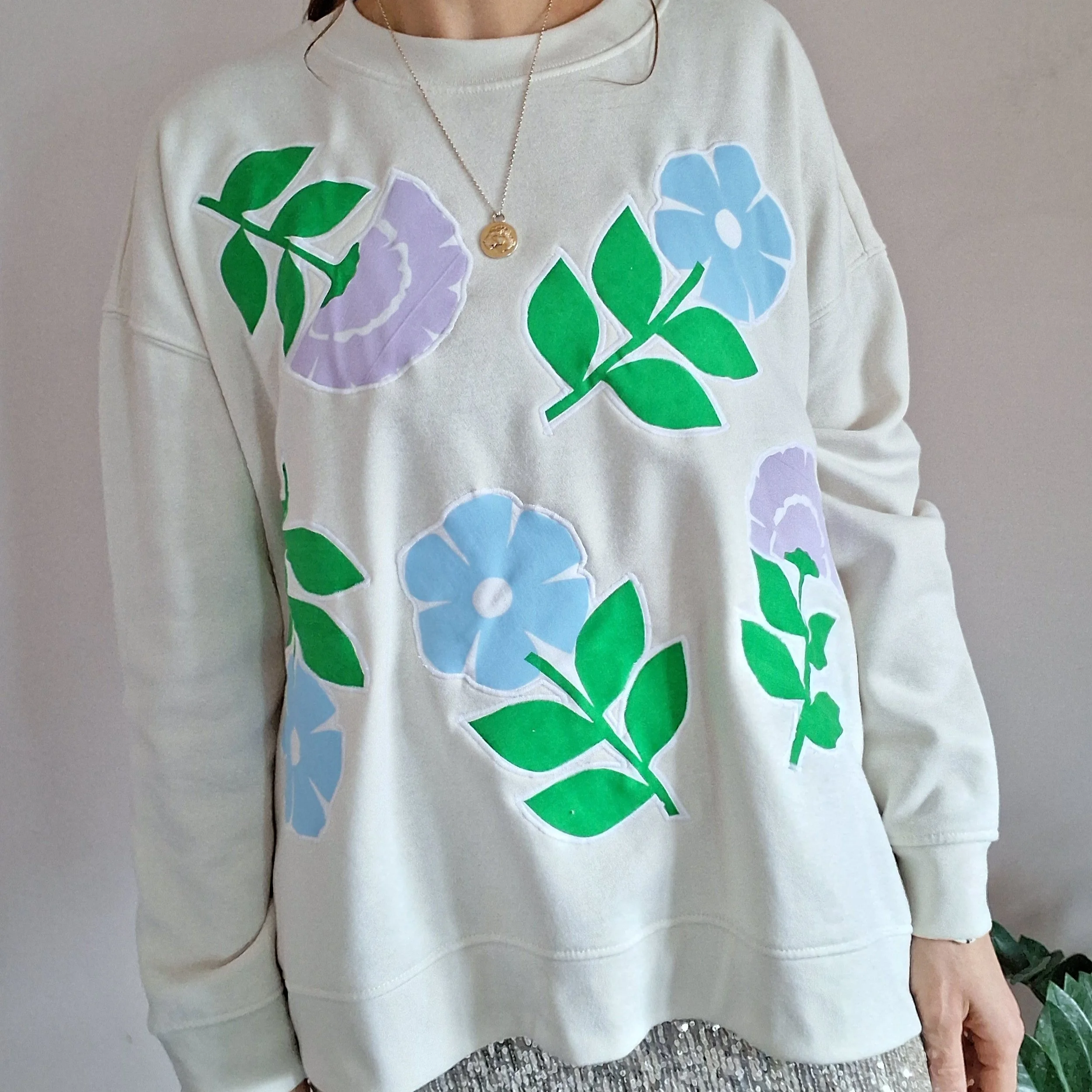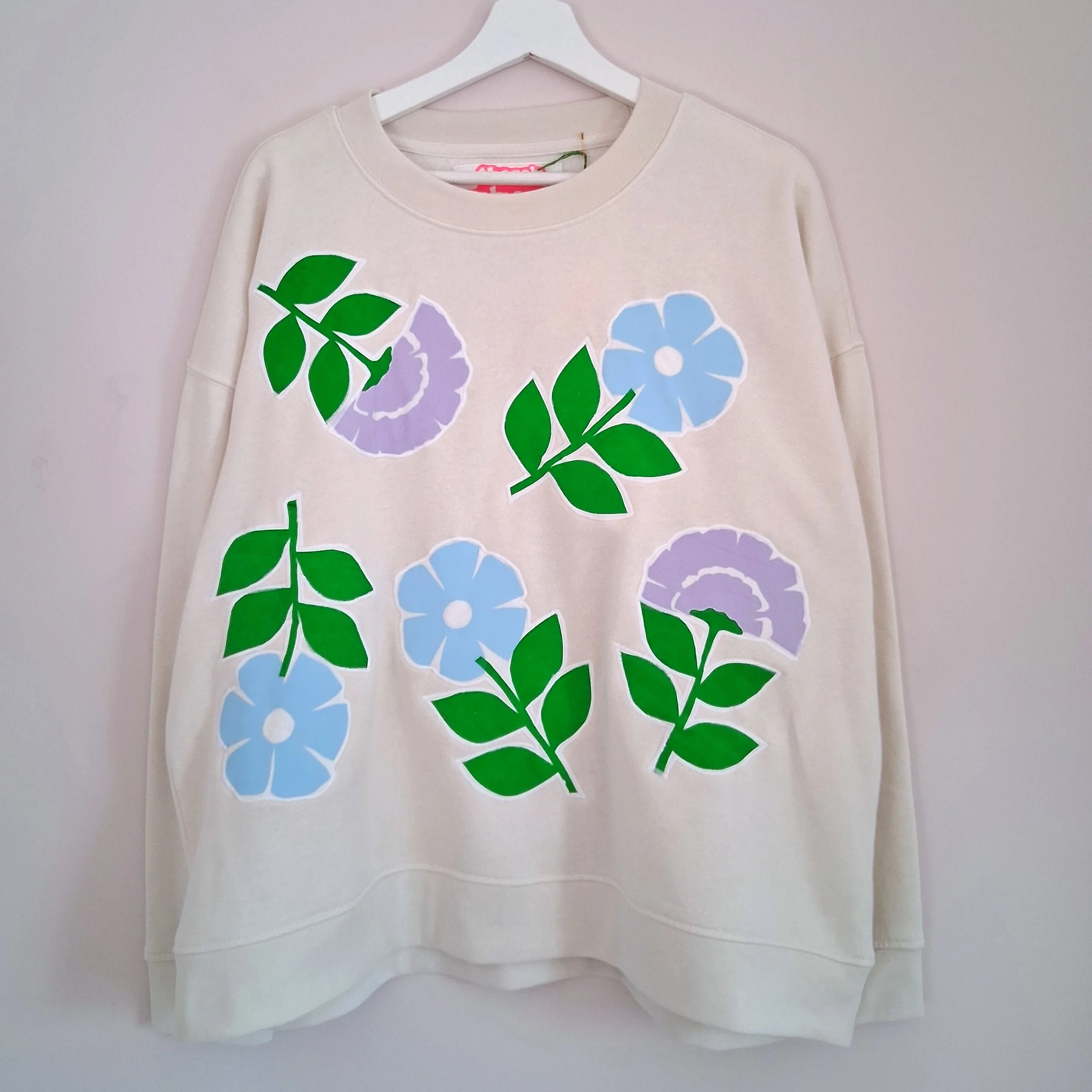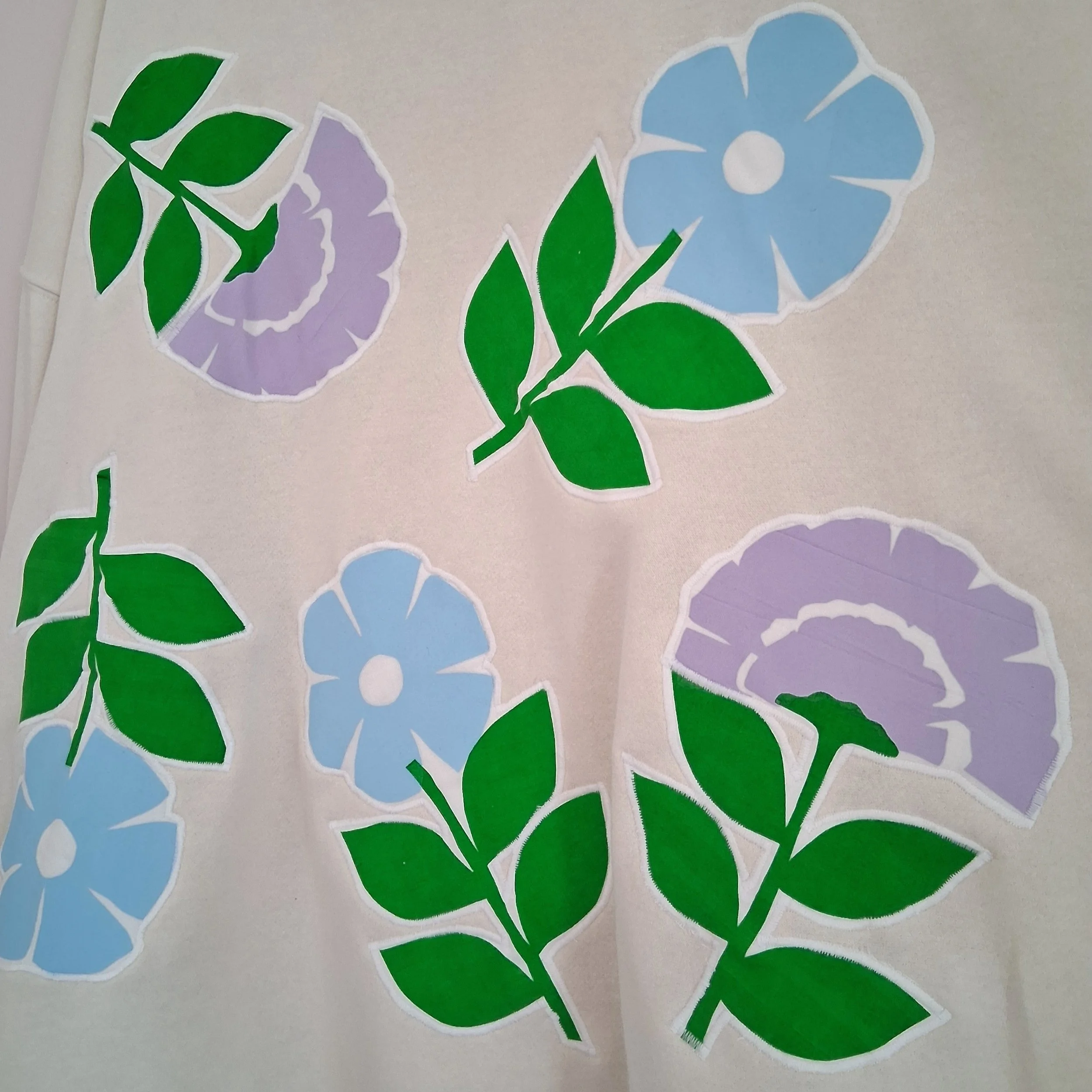 It has been reworked with hand screen printed designs appliqued on to it. The appliqued designs have been printed onto second hand cotton. Every design is one of a kind, the aim being to turn a fast fashion, unloved item into a garment to be cared for and looked after.