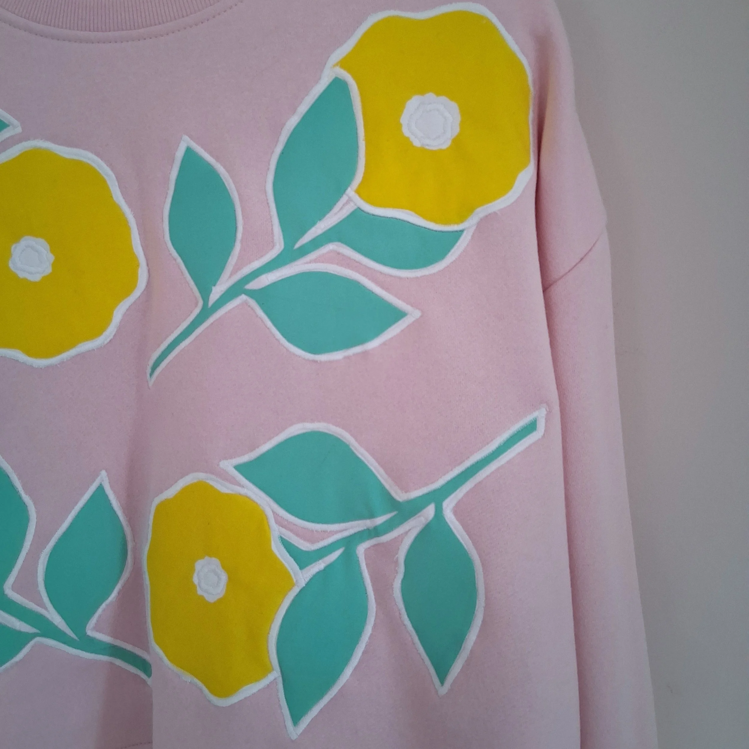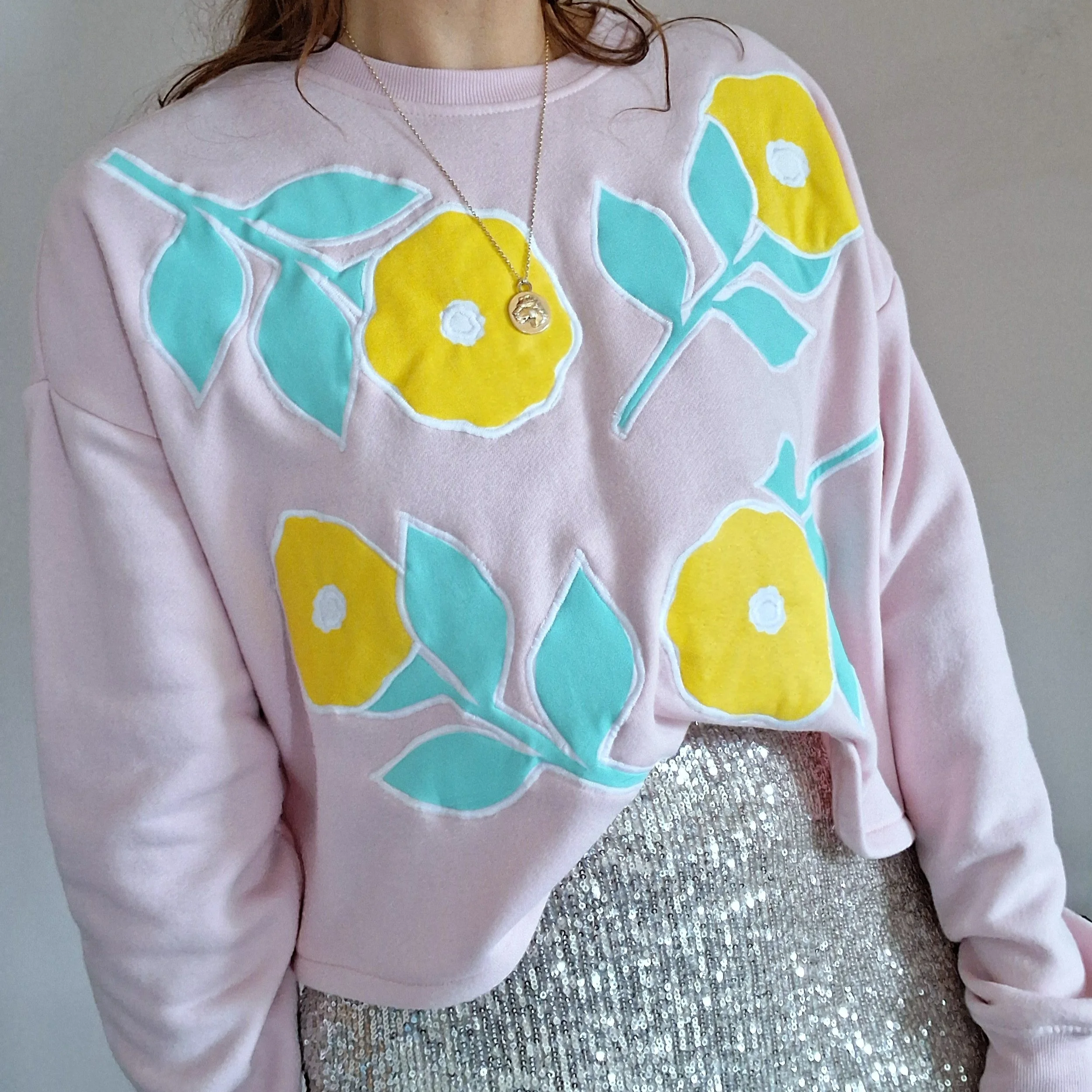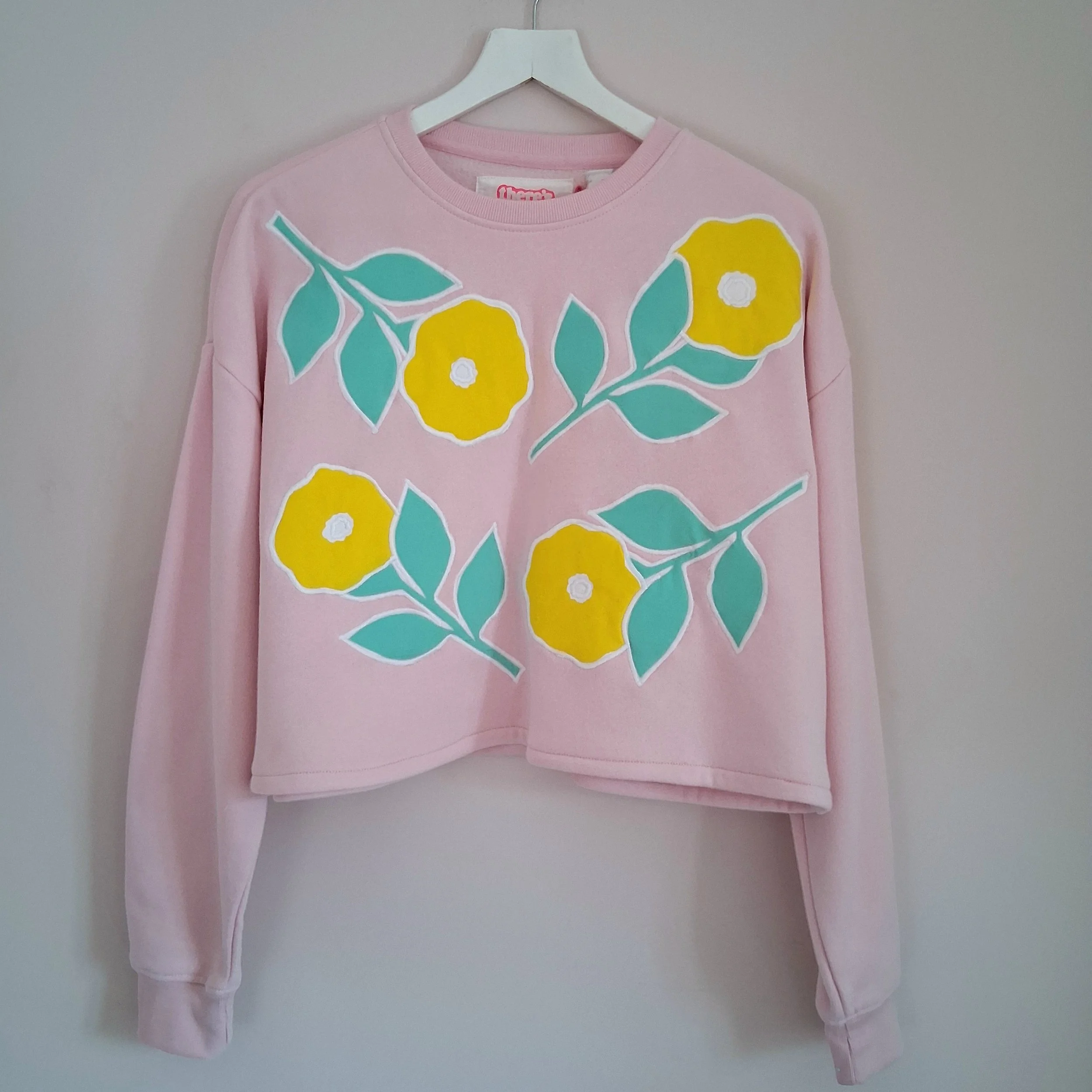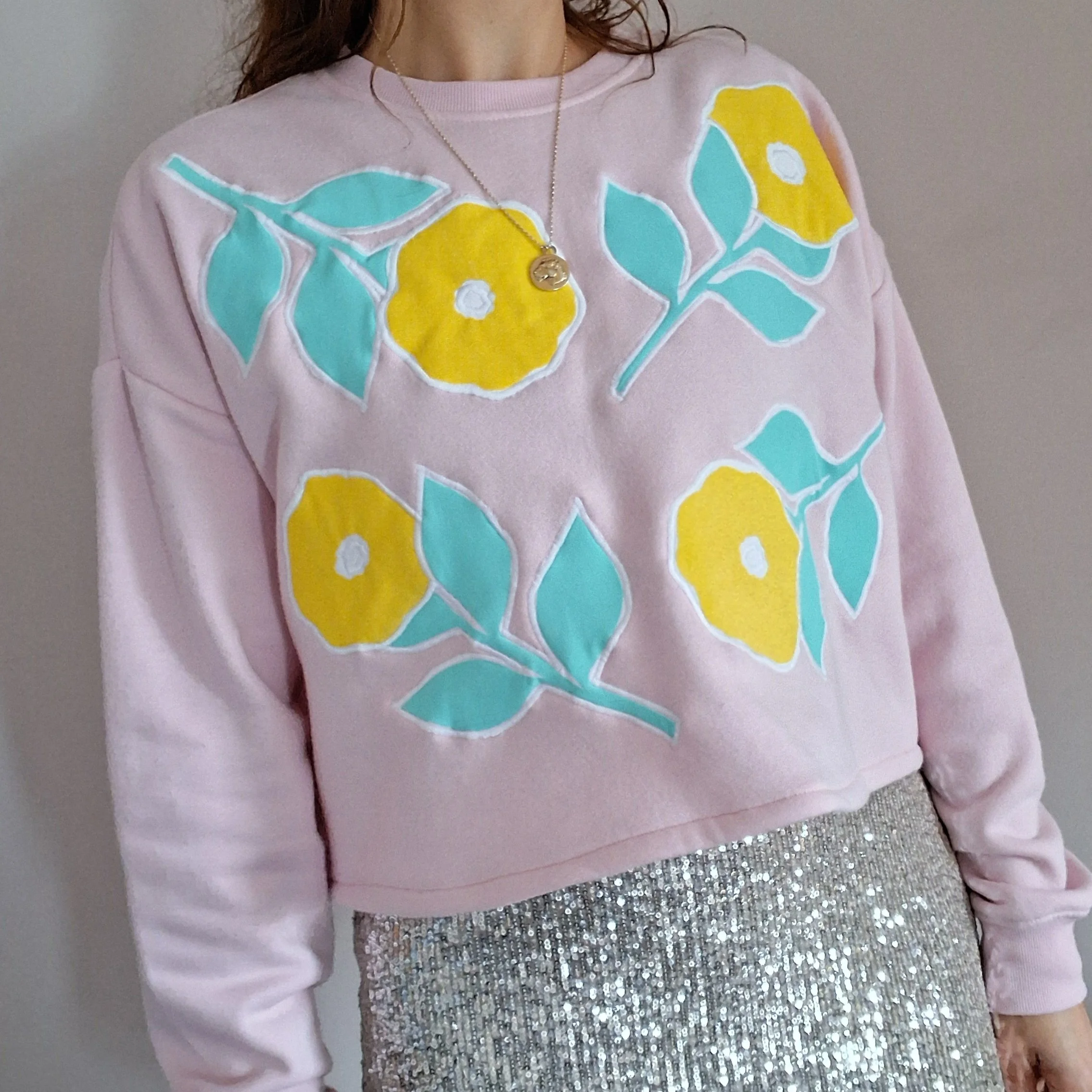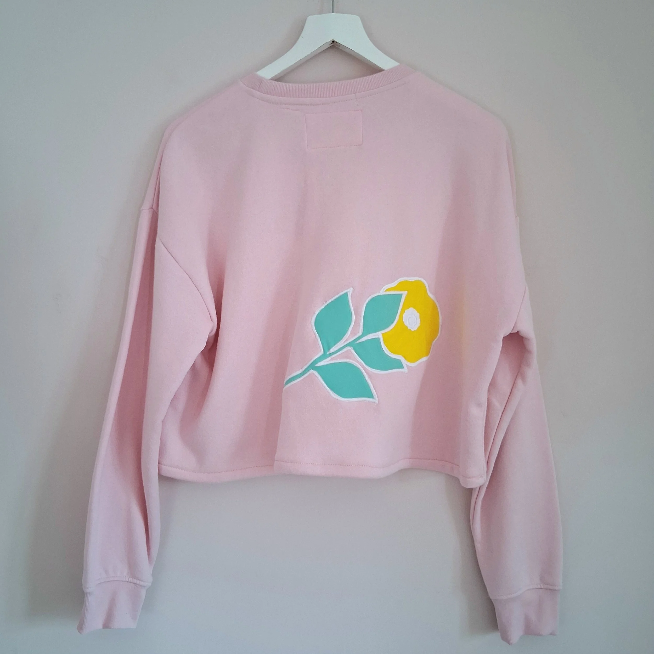 This reworked sweatshirt is a size 12-14 cropped on the waist.