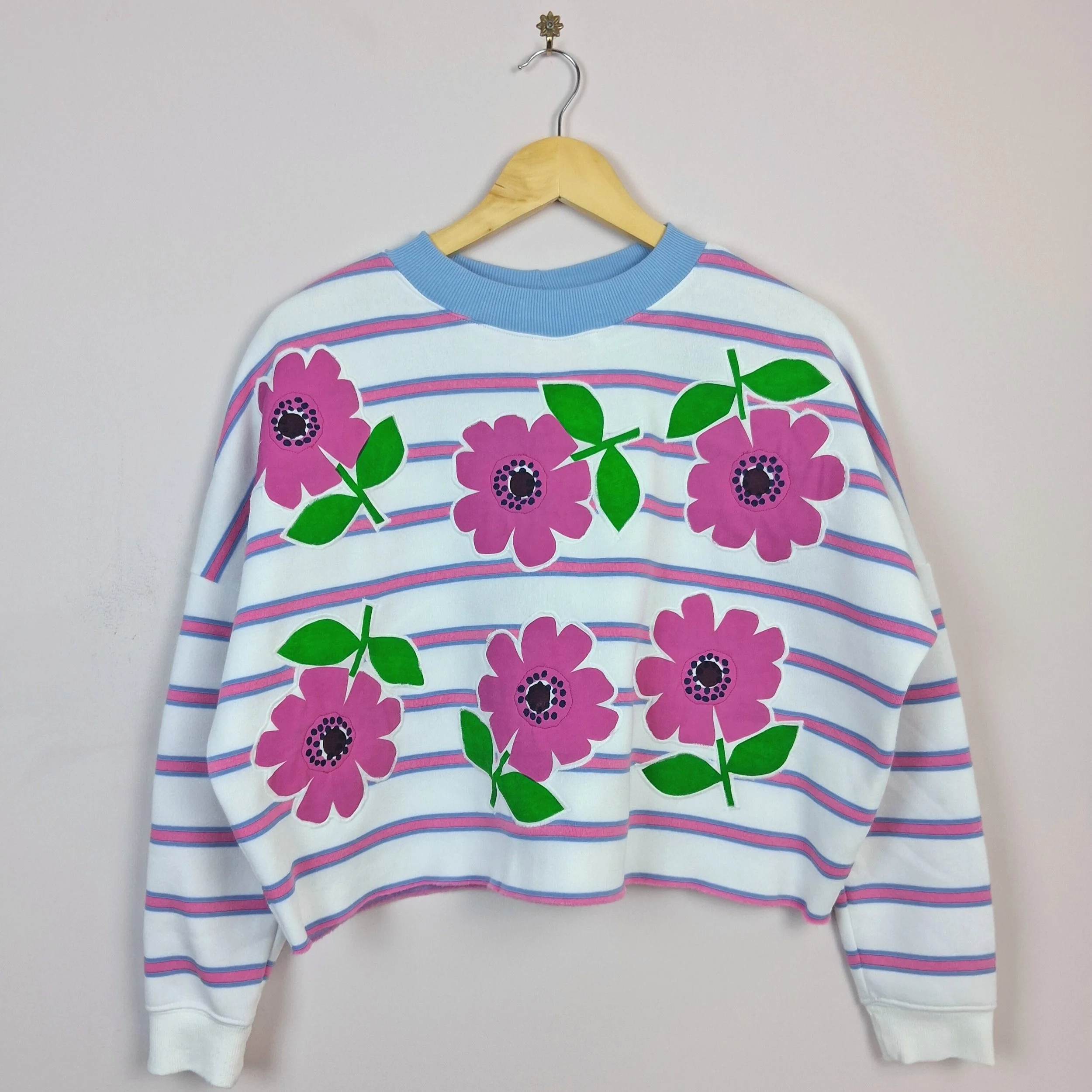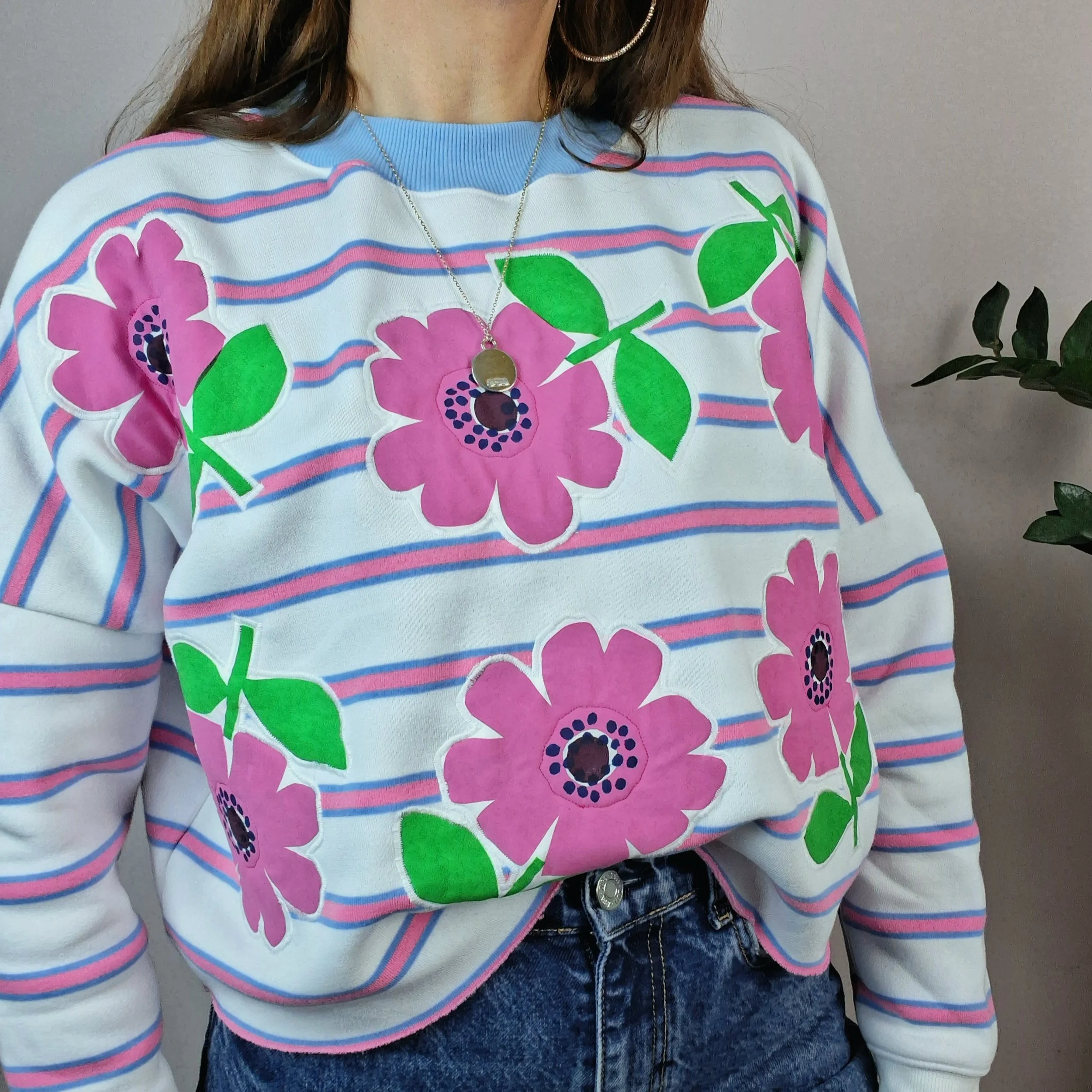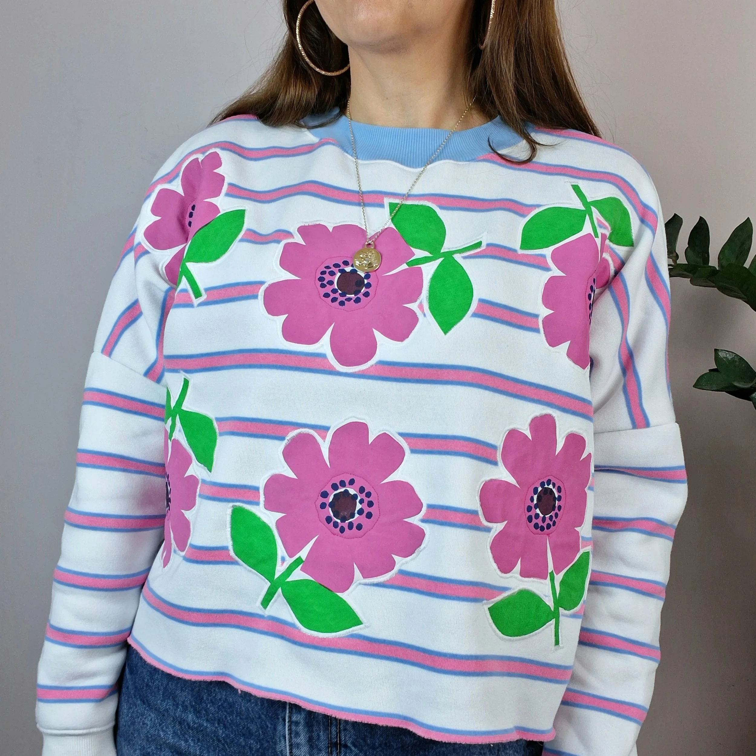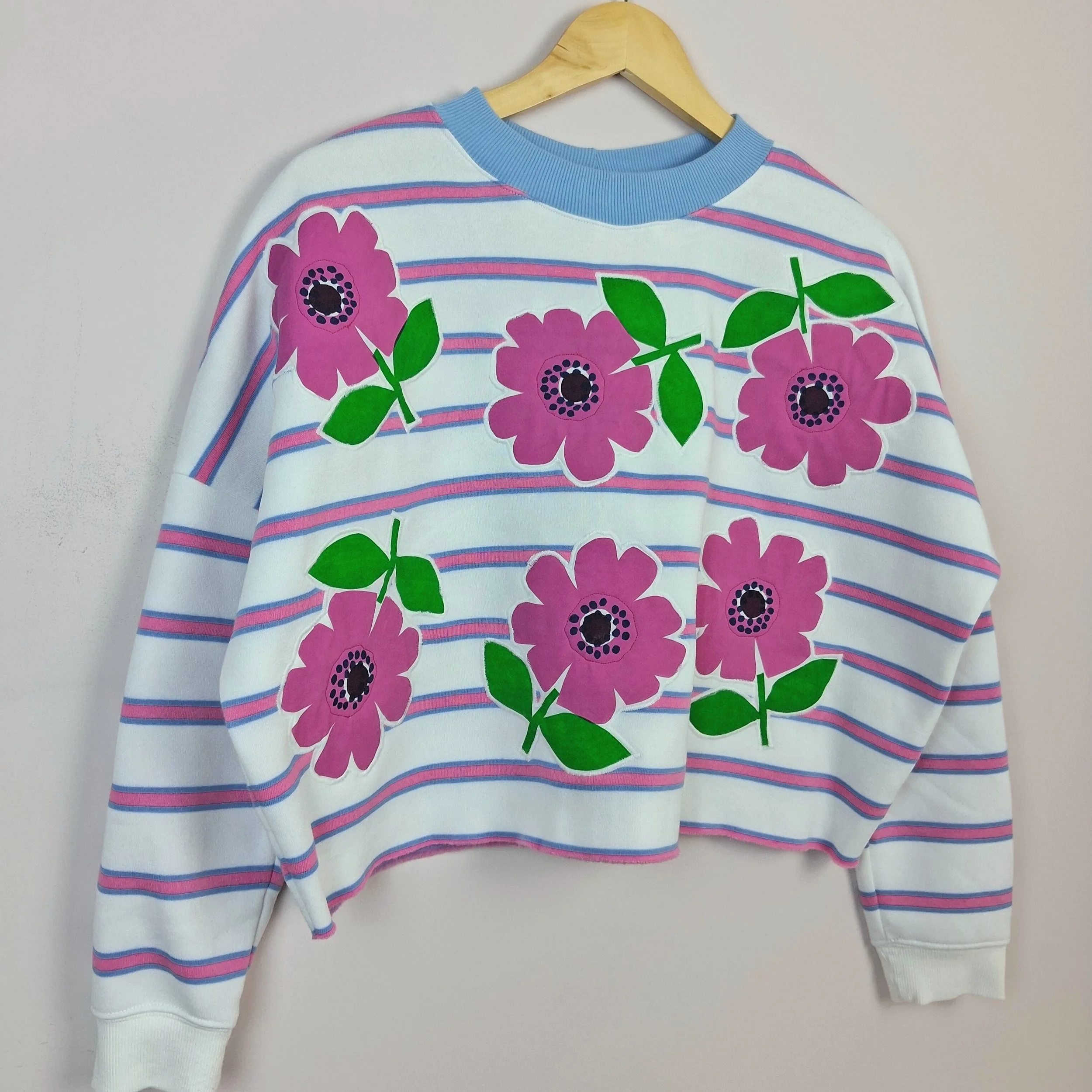 It has been reworked with hand screen printed designs appliqued on to it. The appliqued designs have been printed onto second hand cotton. Every design is one of a kind, the aim being to turn a fast fashion, unloved item into a garment to be cared for and looked after.