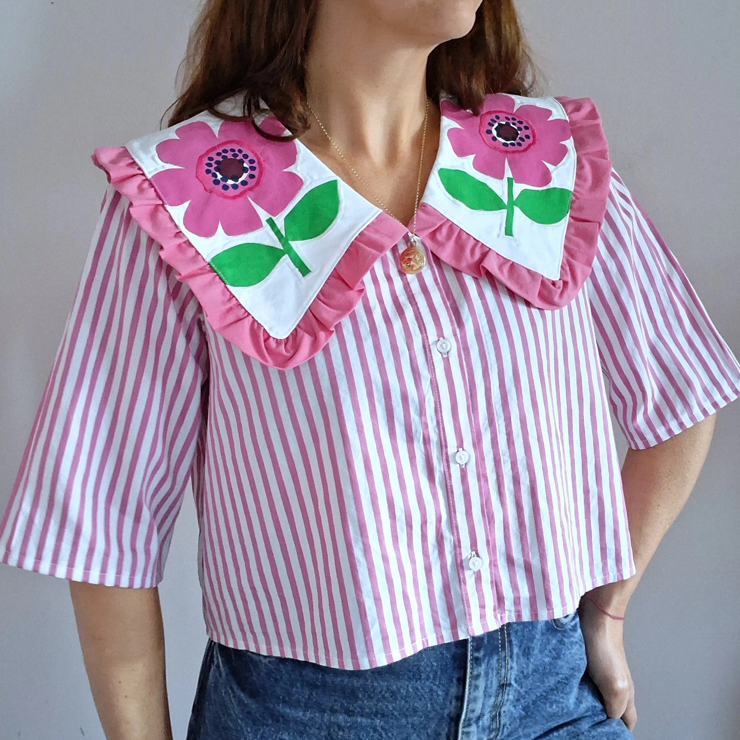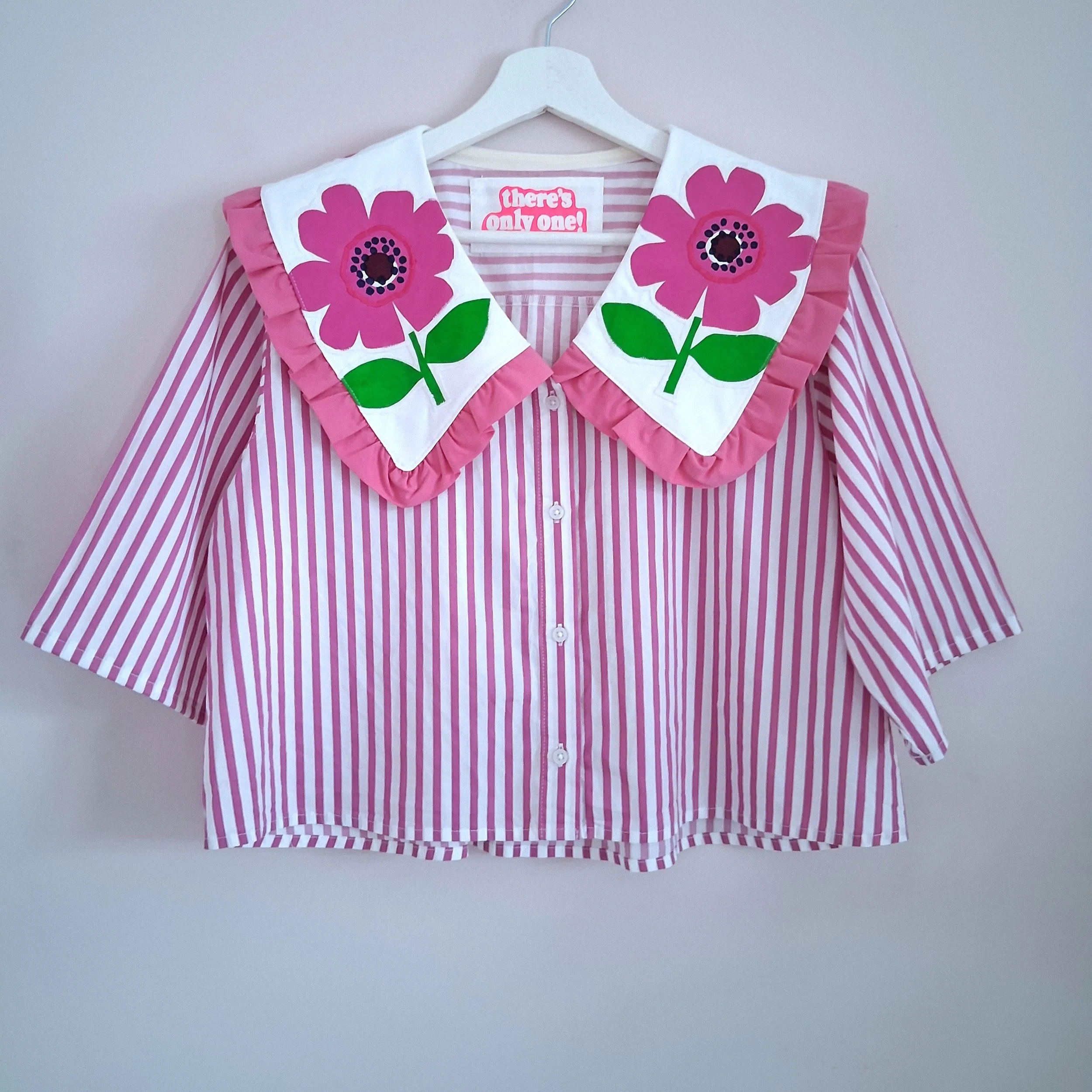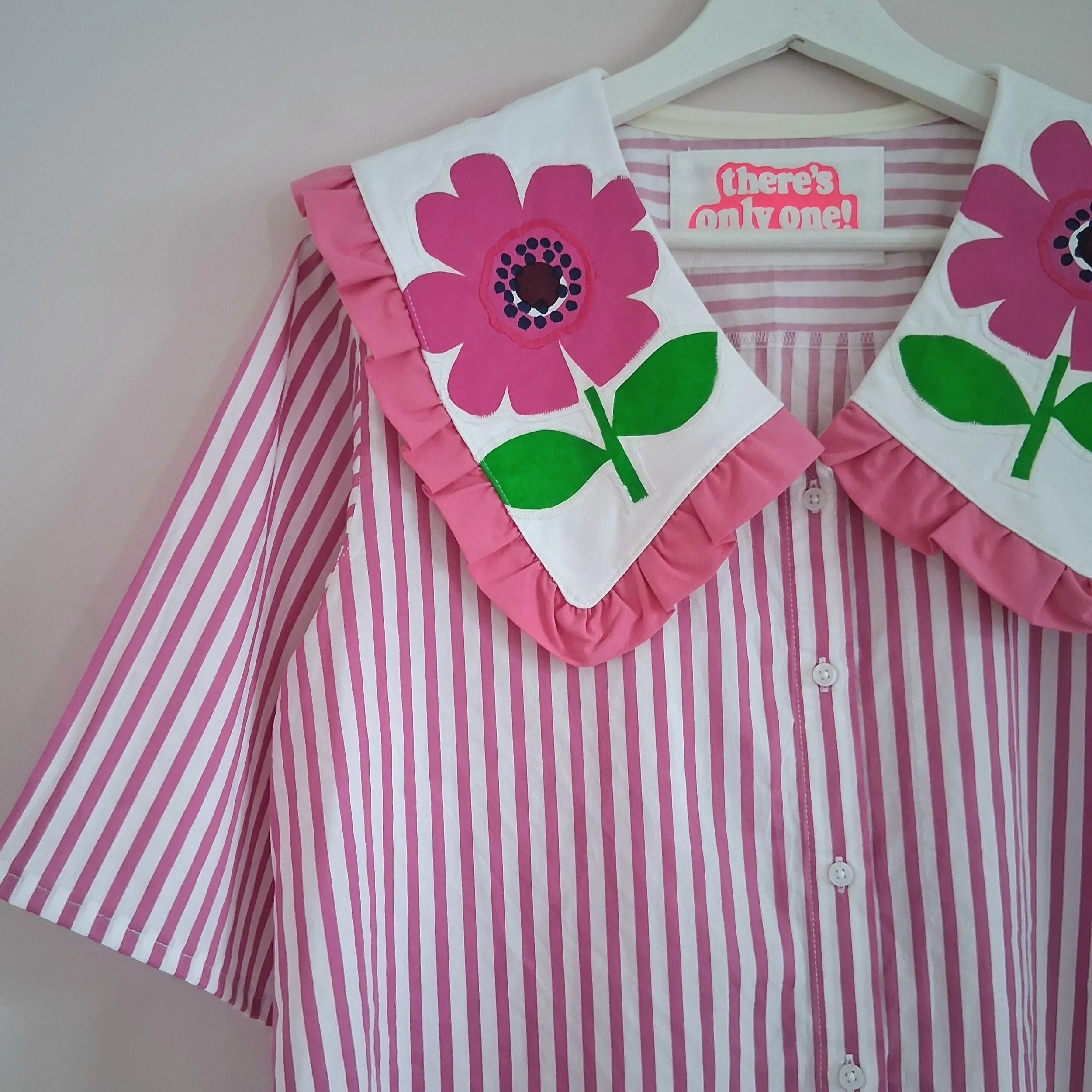 This piece has been reworked from a second shirt. It is a lovely cotton with a very slight sheen to the pink stripes in a UK size 10-12. It has an oversized collar made from secondhand home textiles and hand screen printed designs. Every design is one of a kind with the aim being to turn a secondhand fast fashion item into a garment to be cared for and looked after.