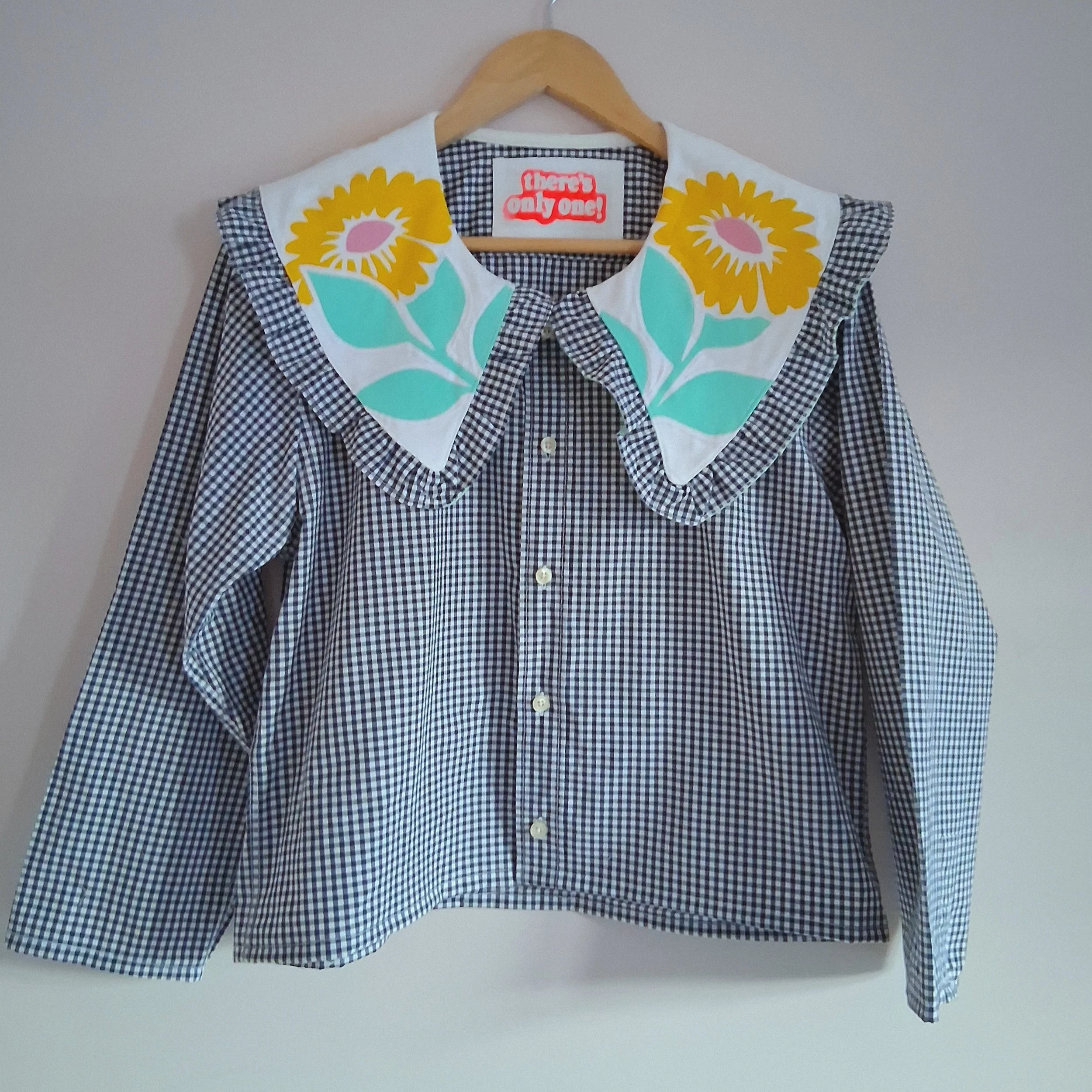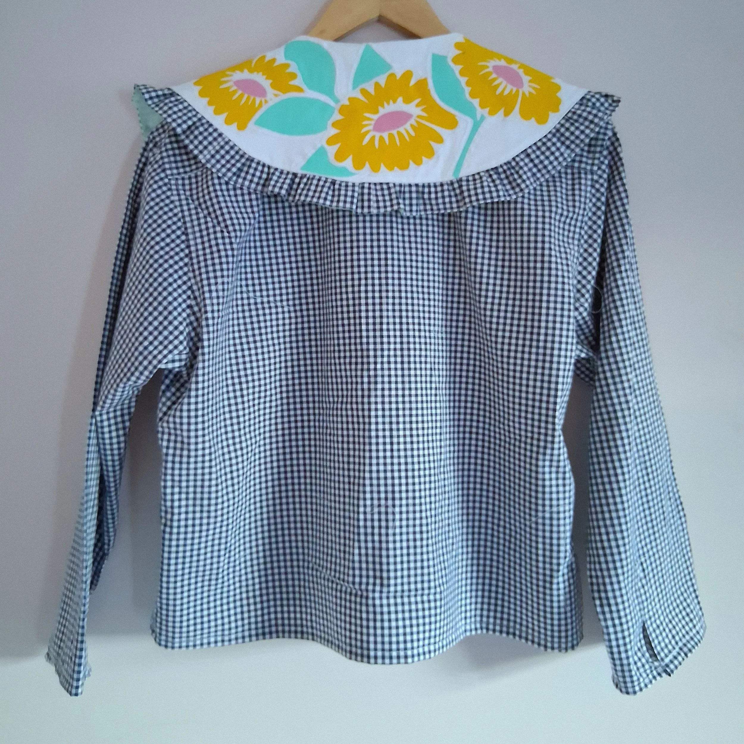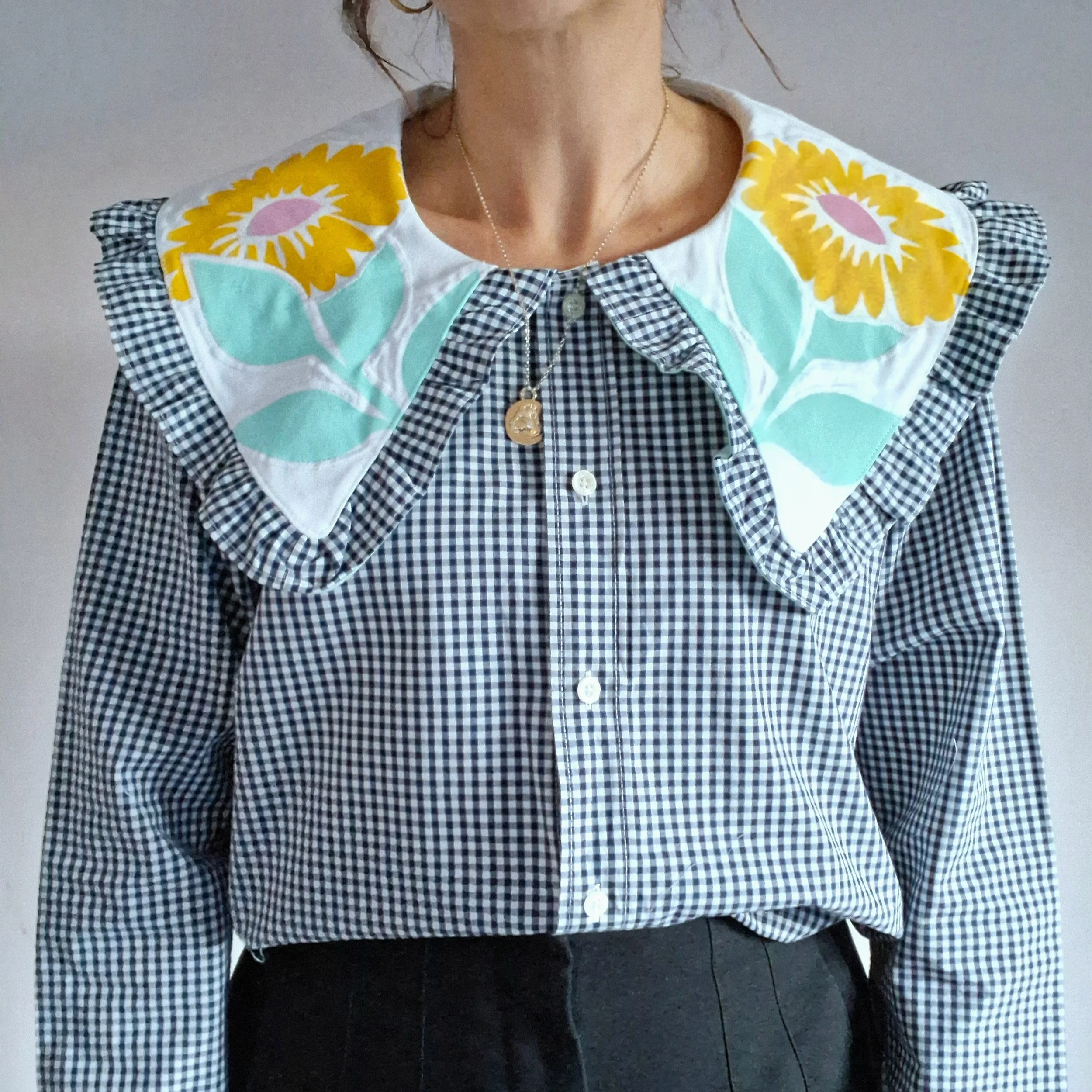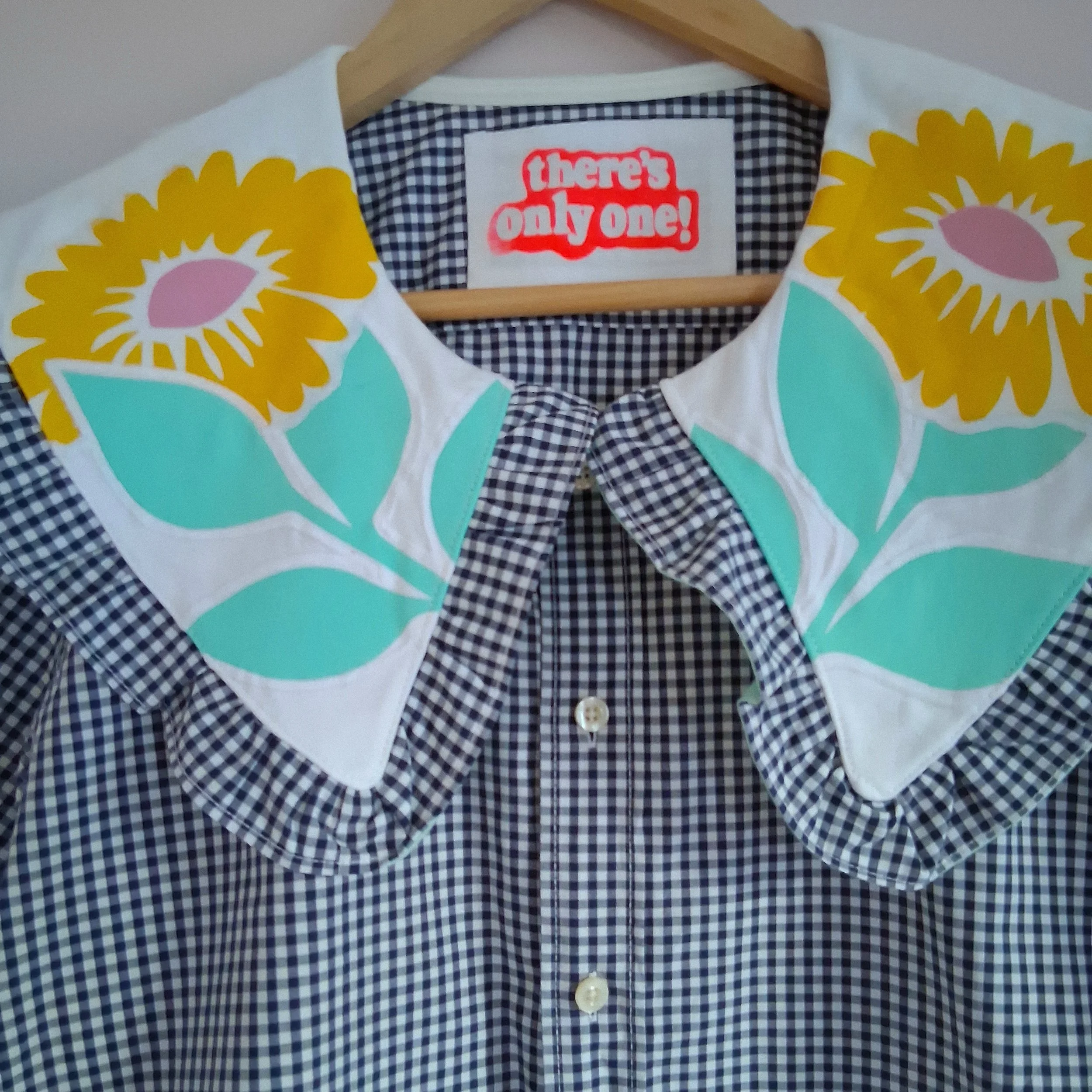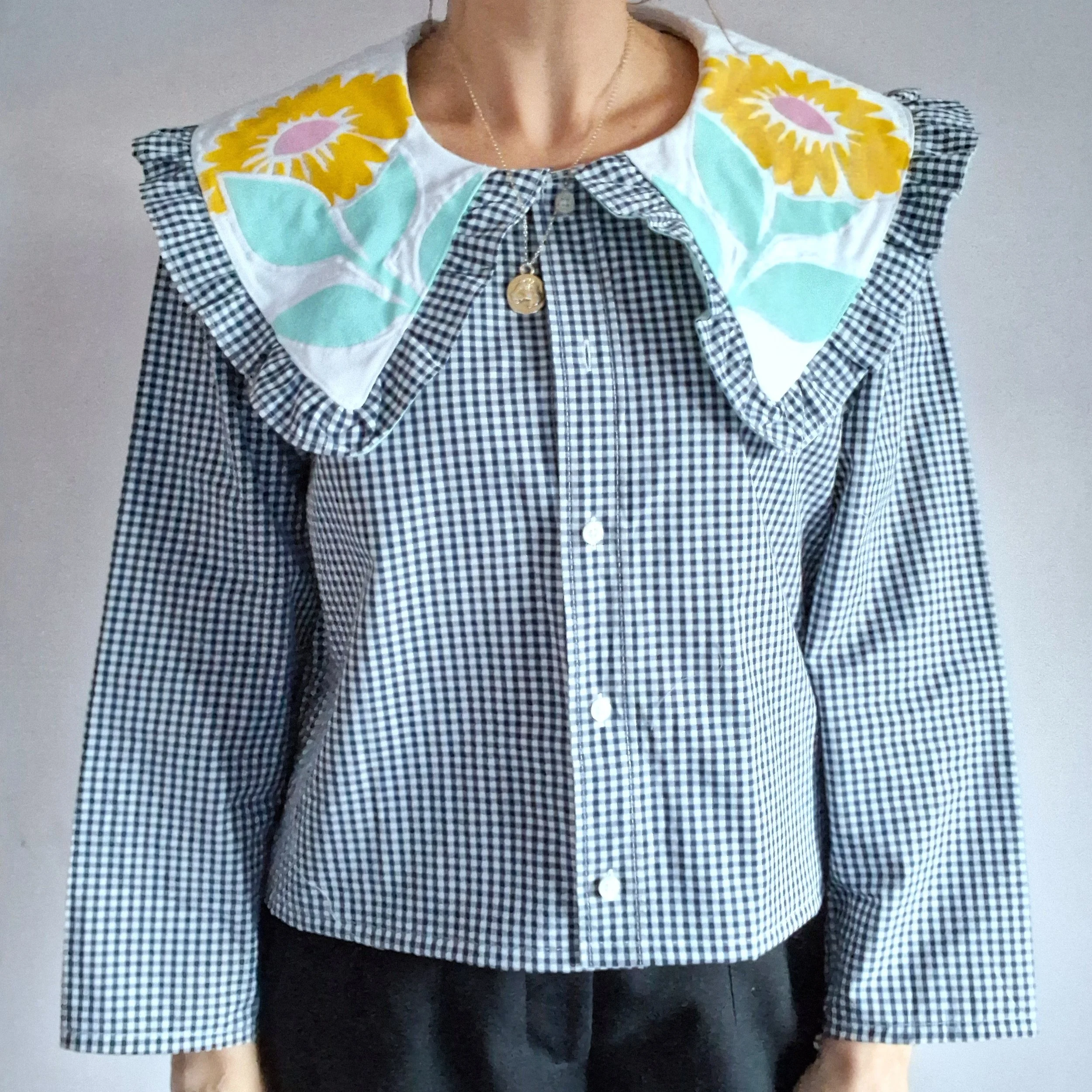 This piece has been reworked from a second shirt. It is a UK size 12-14 in a black gingham. It has an oversized collar made from secondhand home textiles with hand screen printed designs. Every design is one of a kind with the aim being to turn a secondhand fast fashion item into a garment to be cared for and looked after.