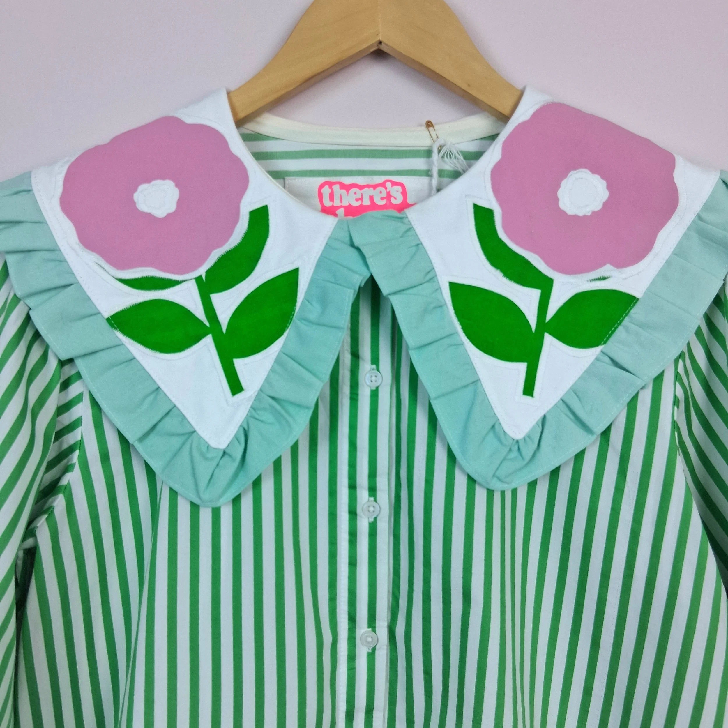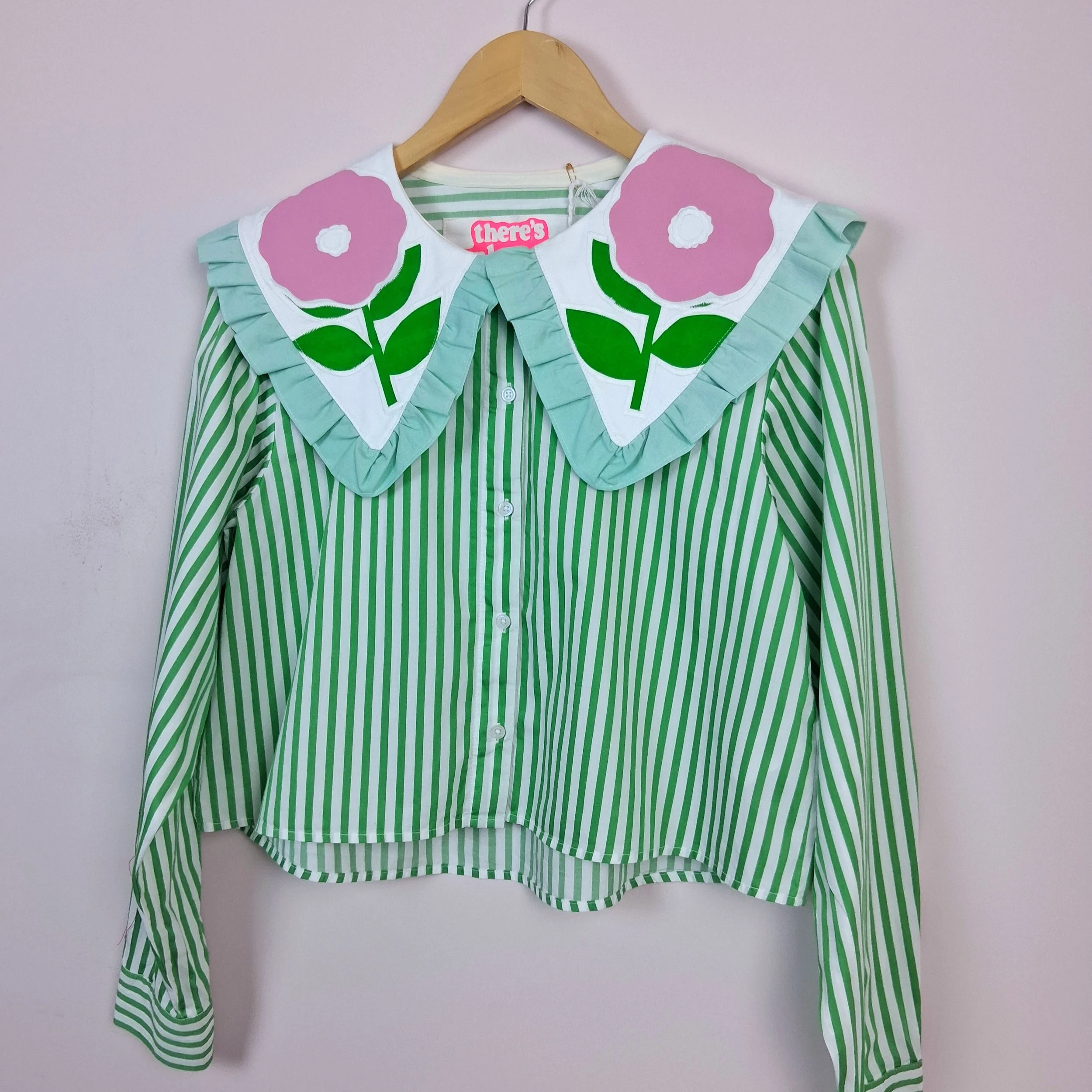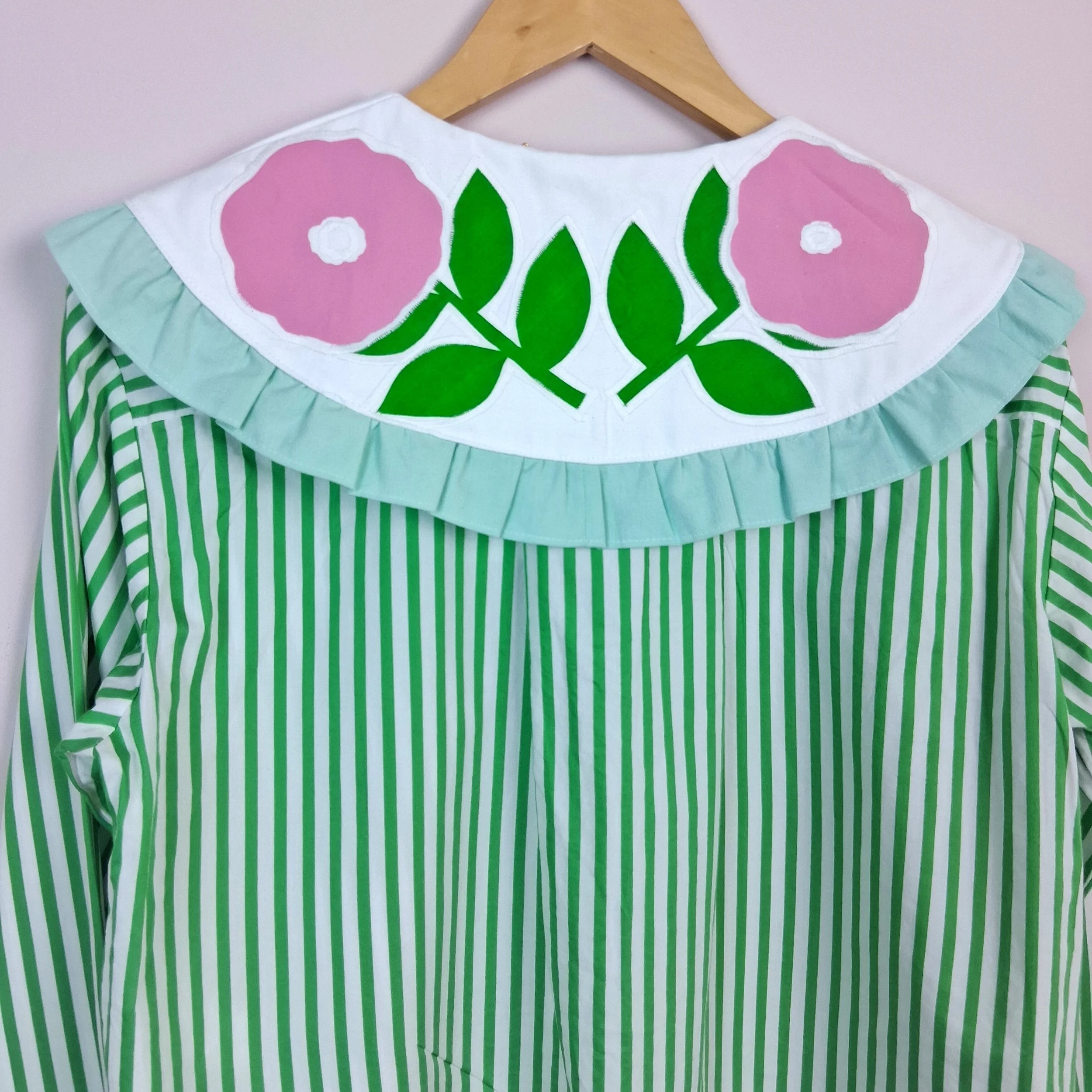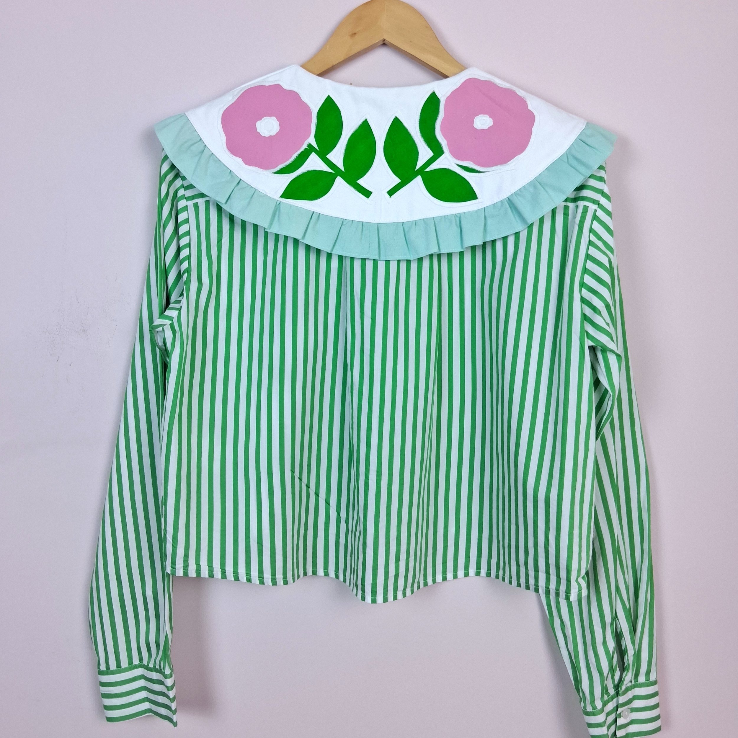 This piece has been reworked from a second hand shirt and is a size 10-12 with a bright green stripe.