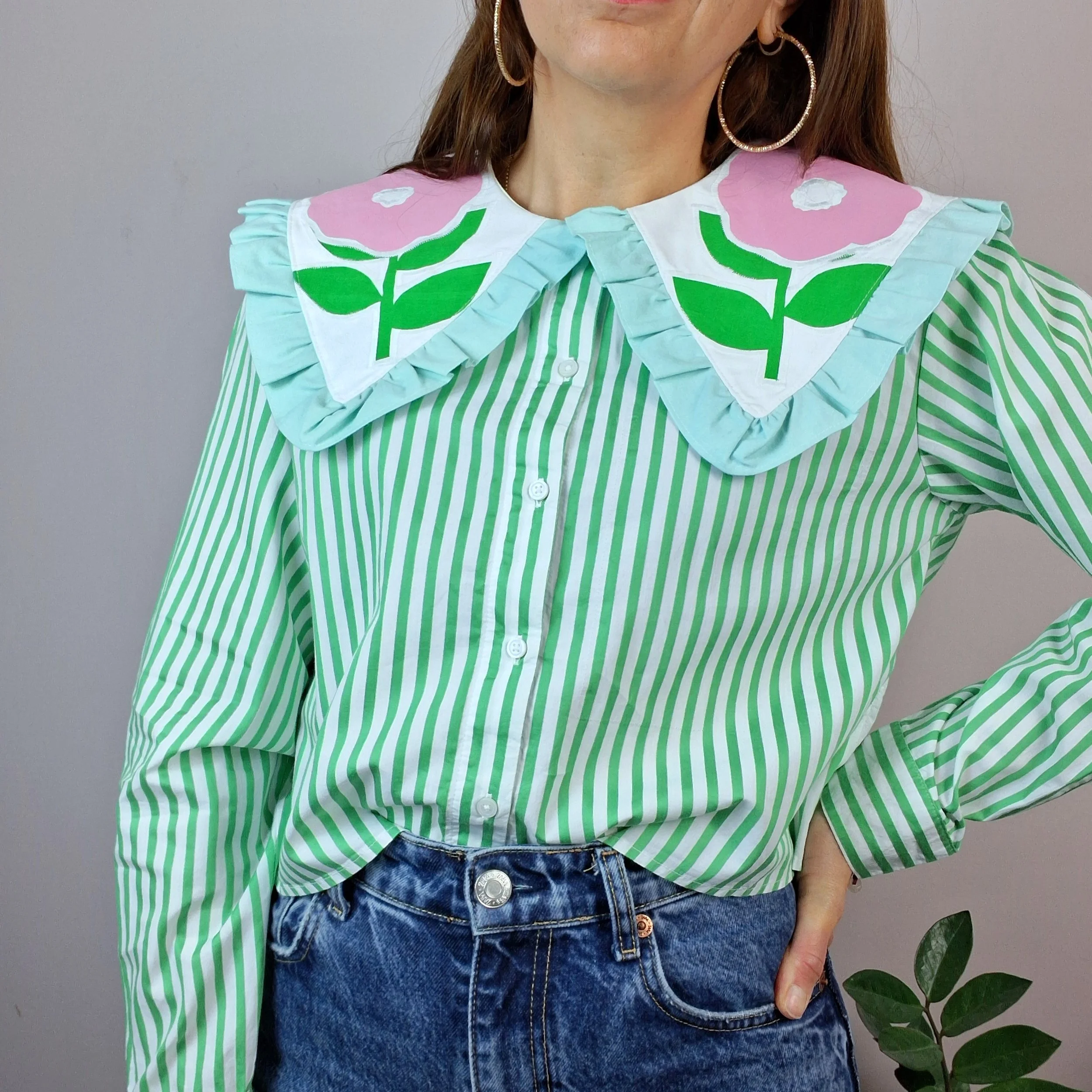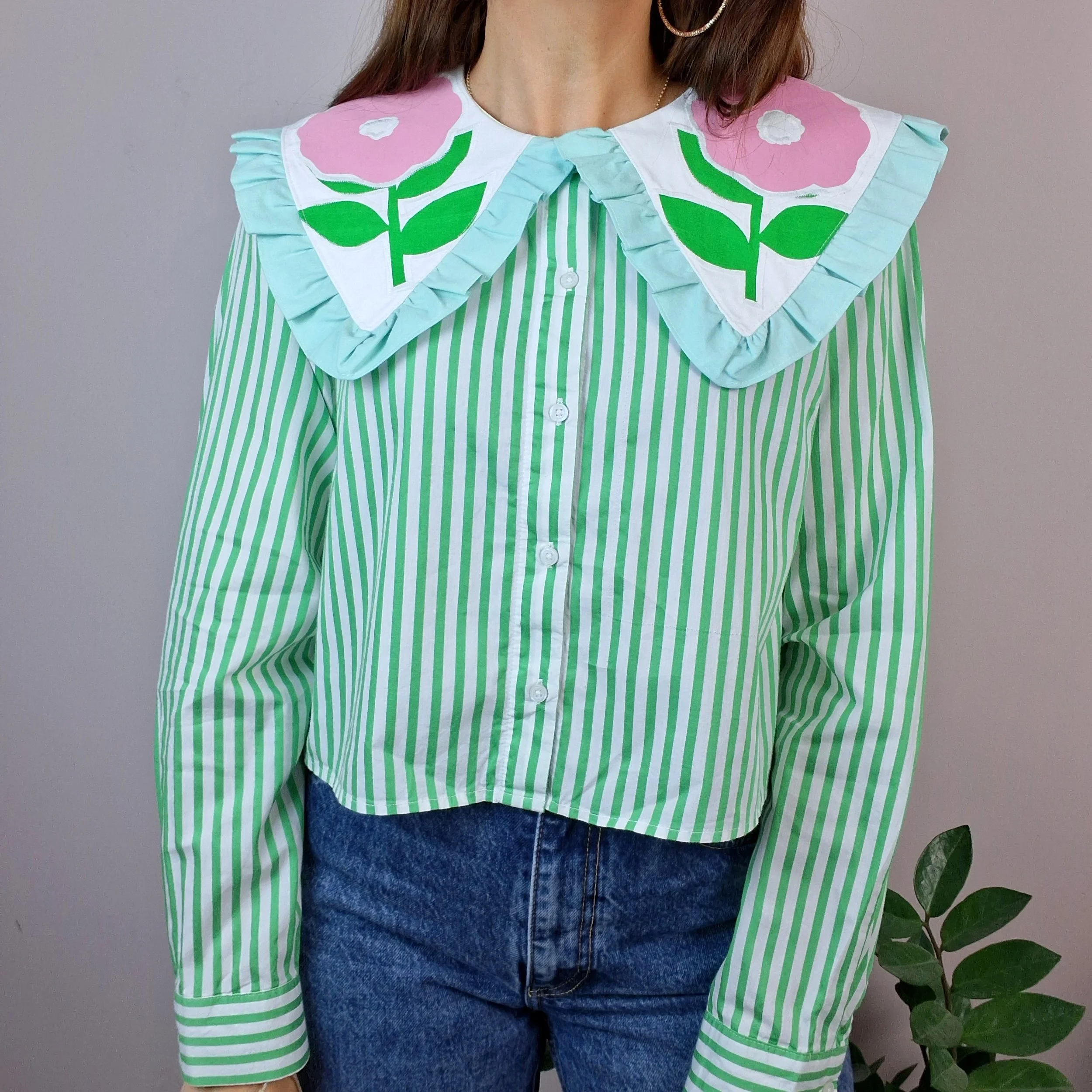 It has an oversized collar made from secondhand home textiles with hand screen printed designs. Every design is one of a kind with the aim being to turn a secondhand fast fashion item into a garment to be cared for and looked after.