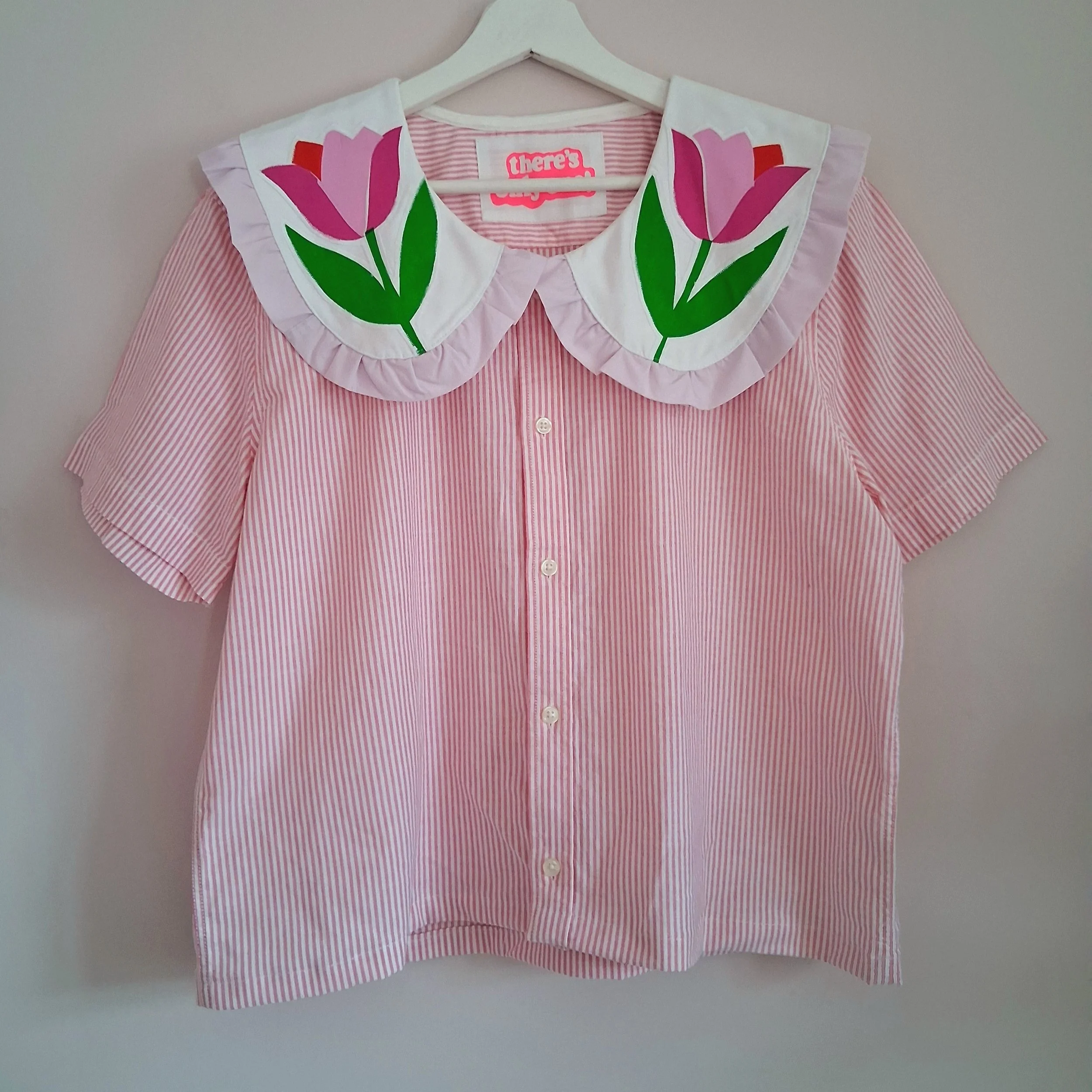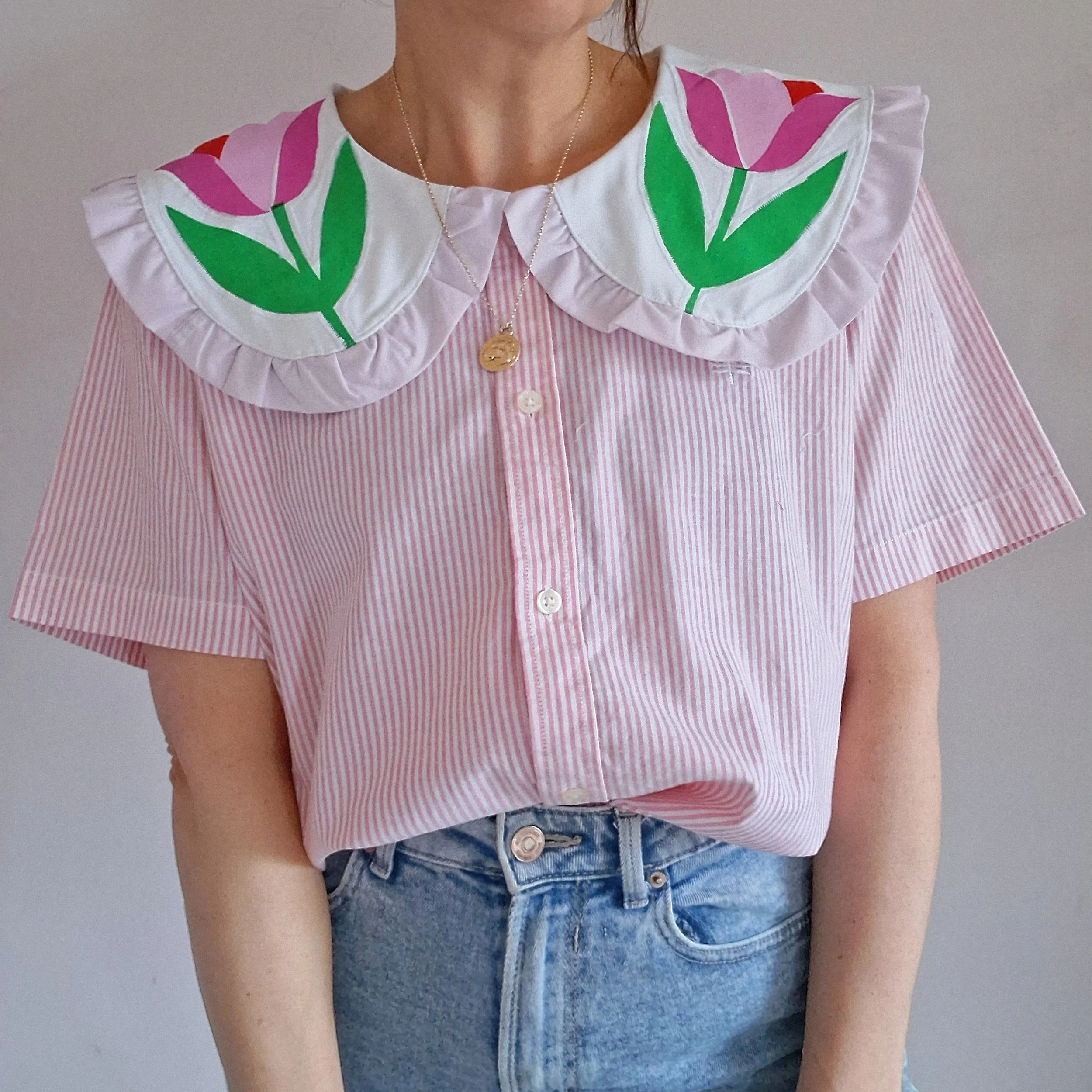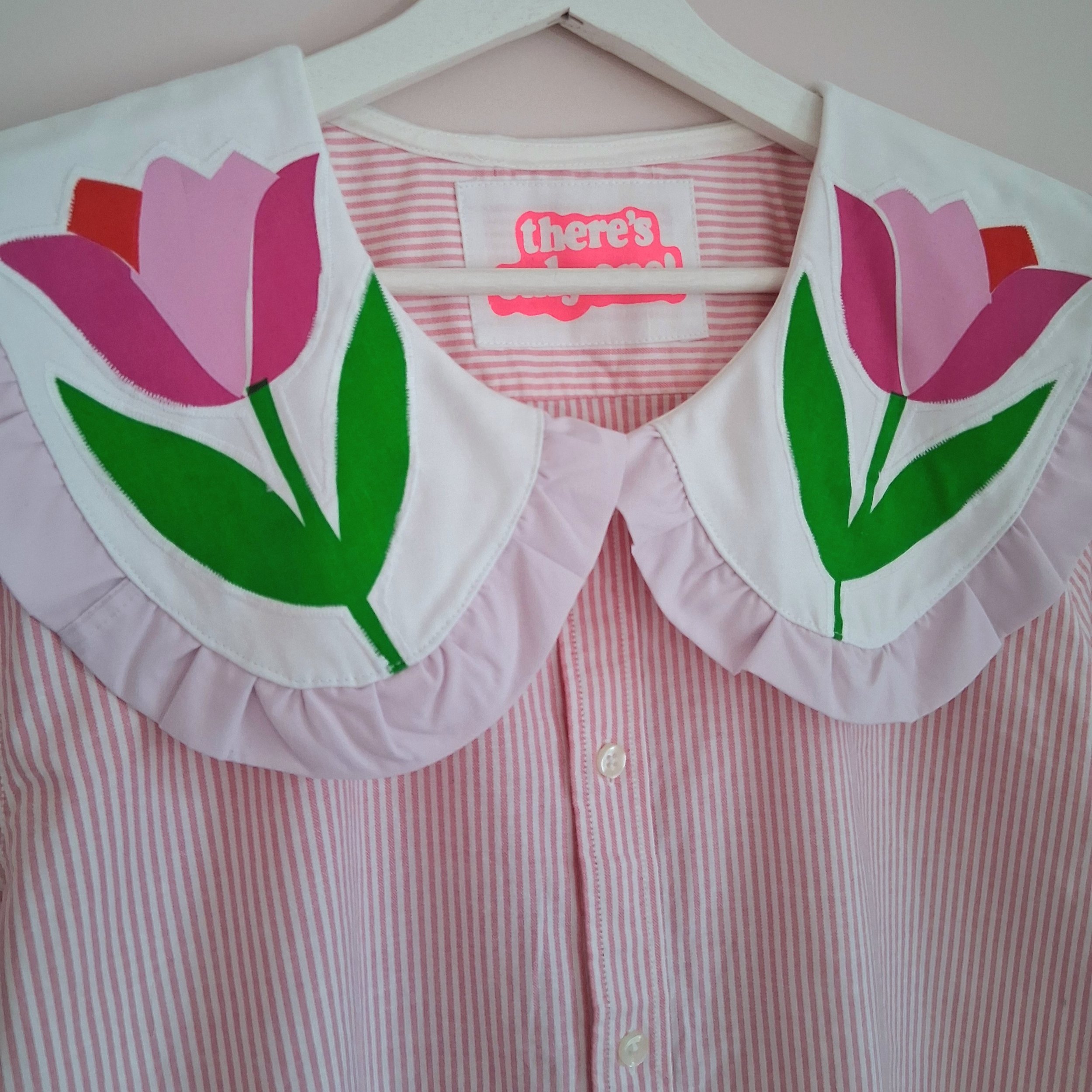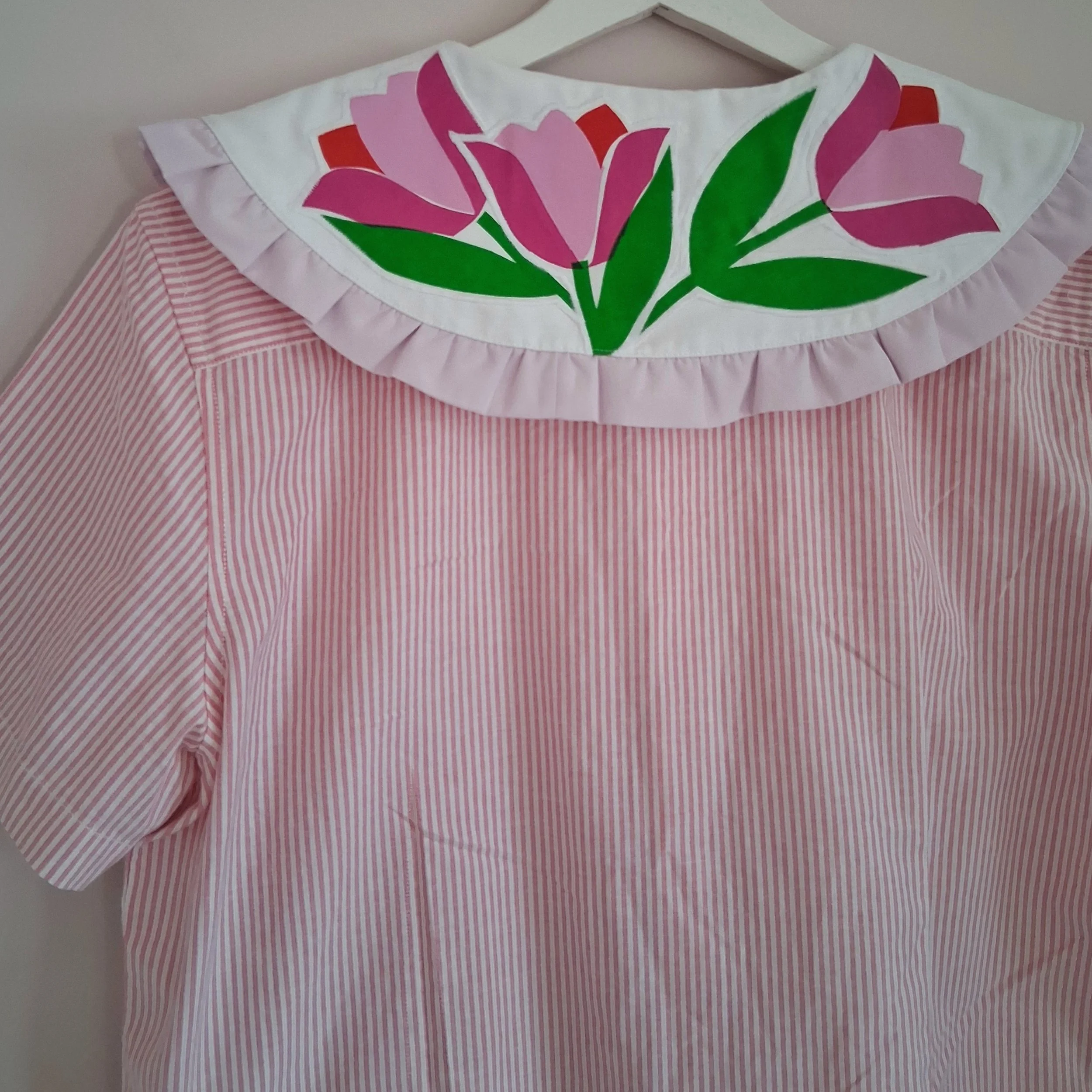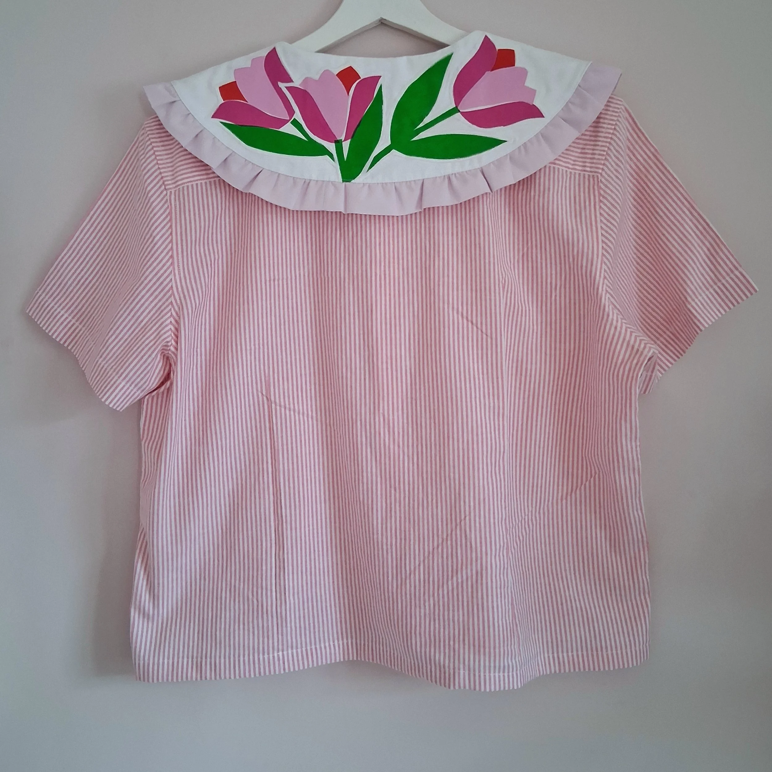 This piece has been reworked from a second hand shirt and home textiles, along with hand screen printed designs, so every part of the garment is made using reclaimed textiles.