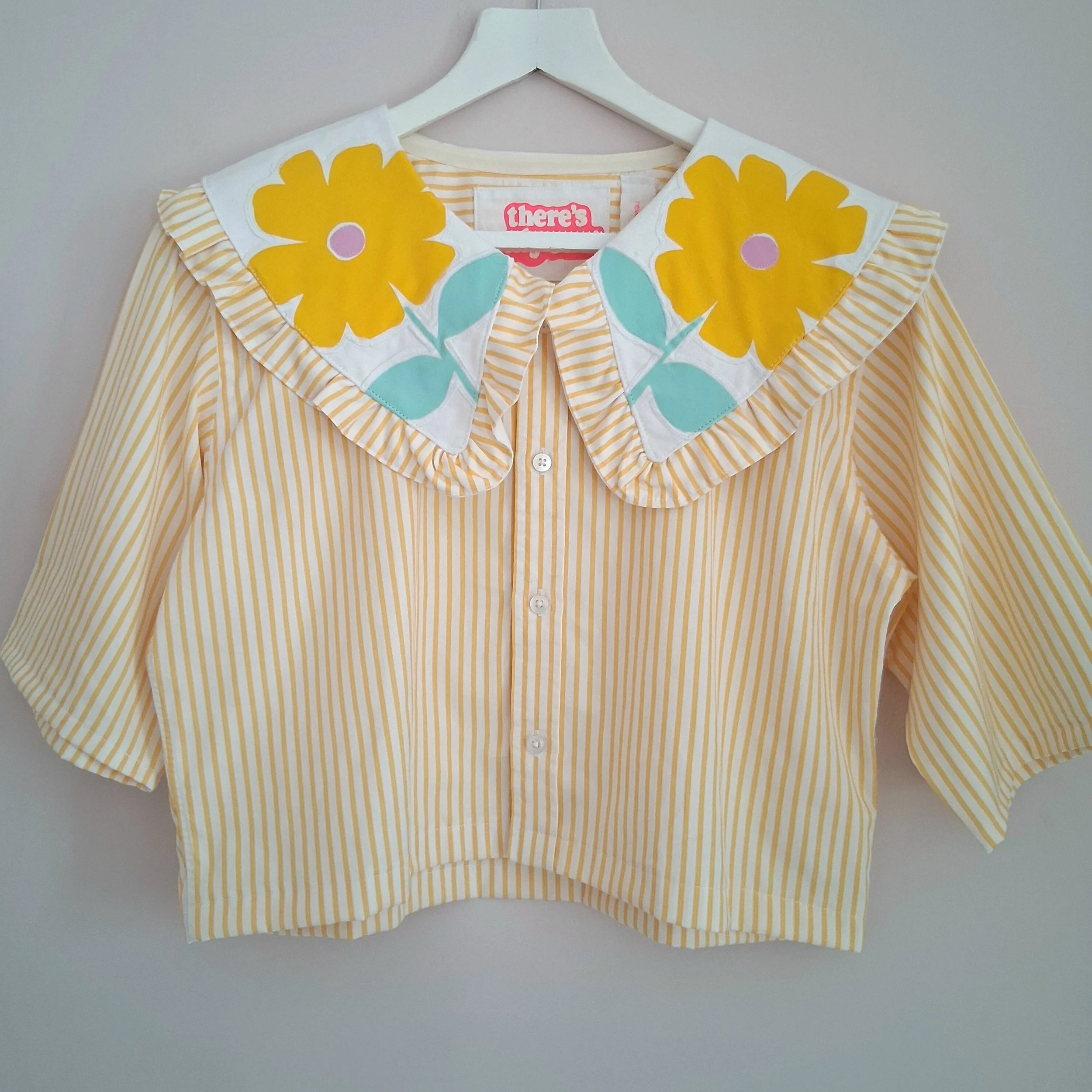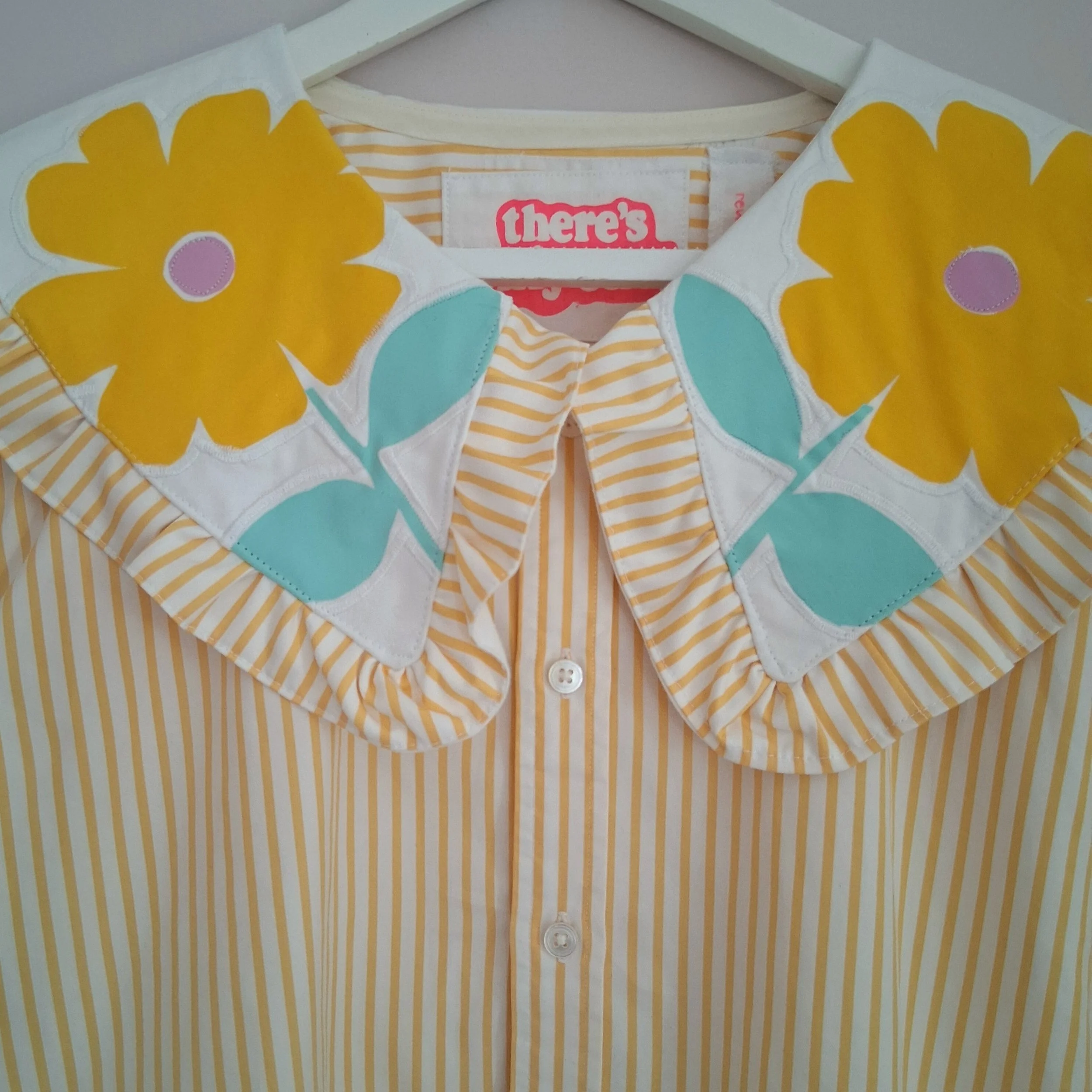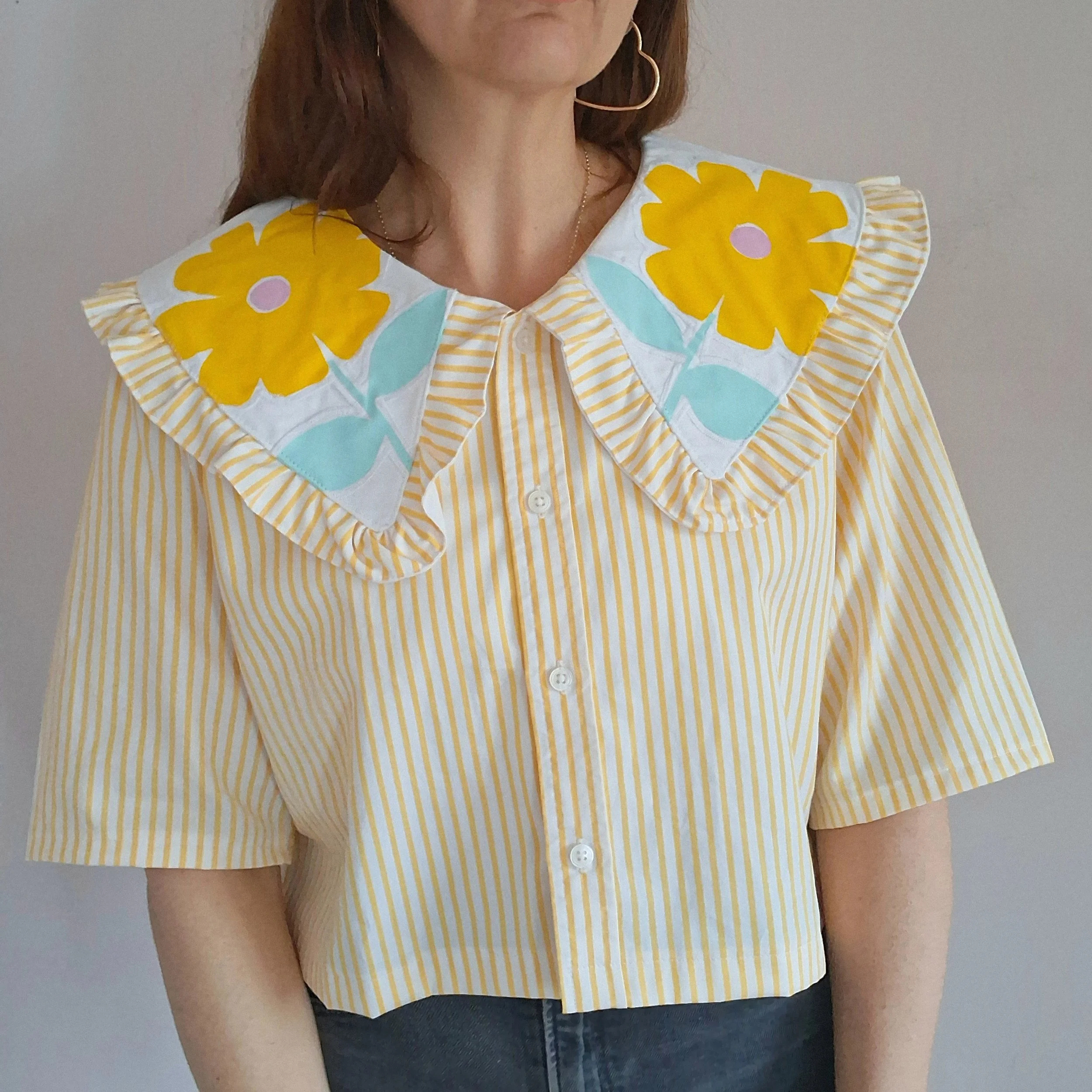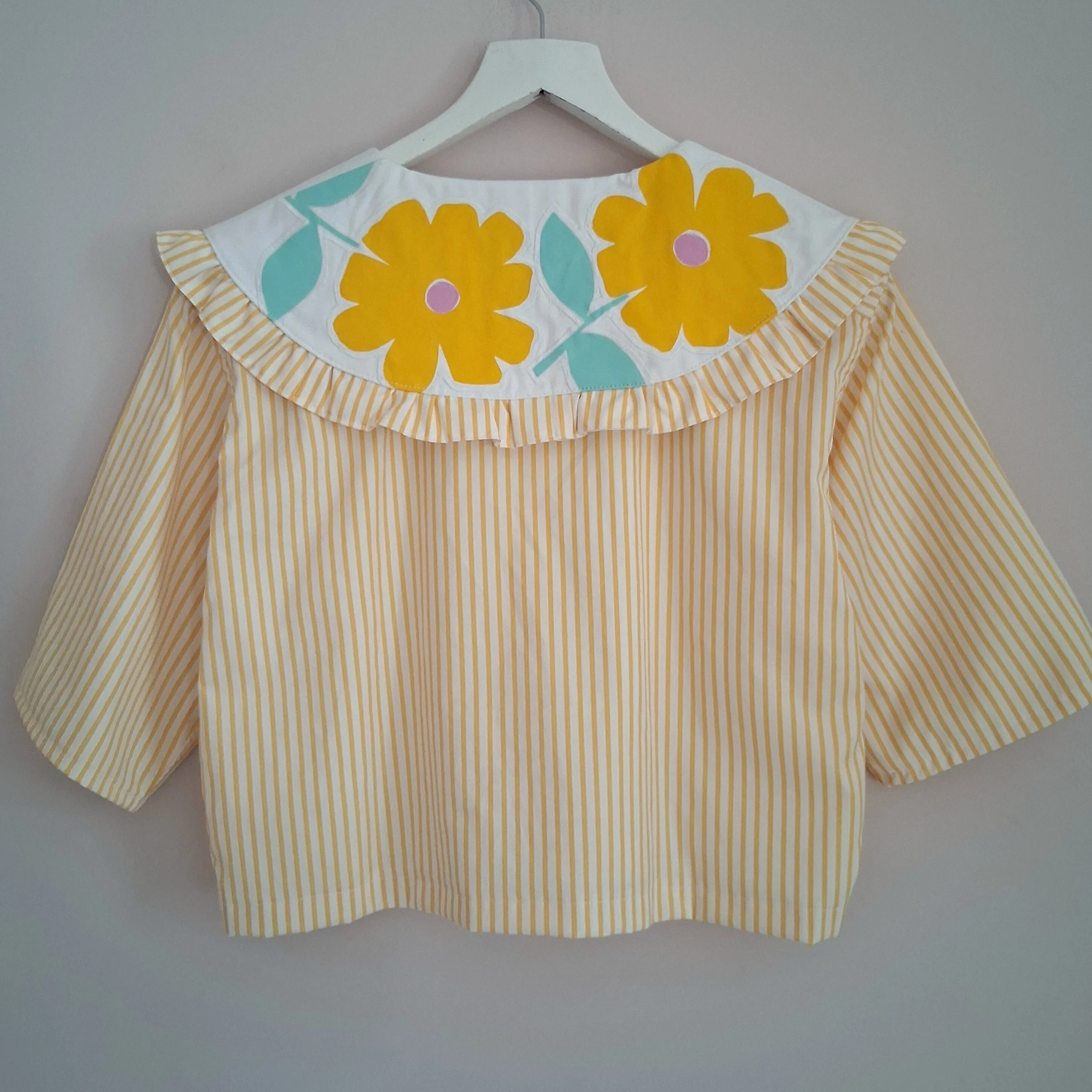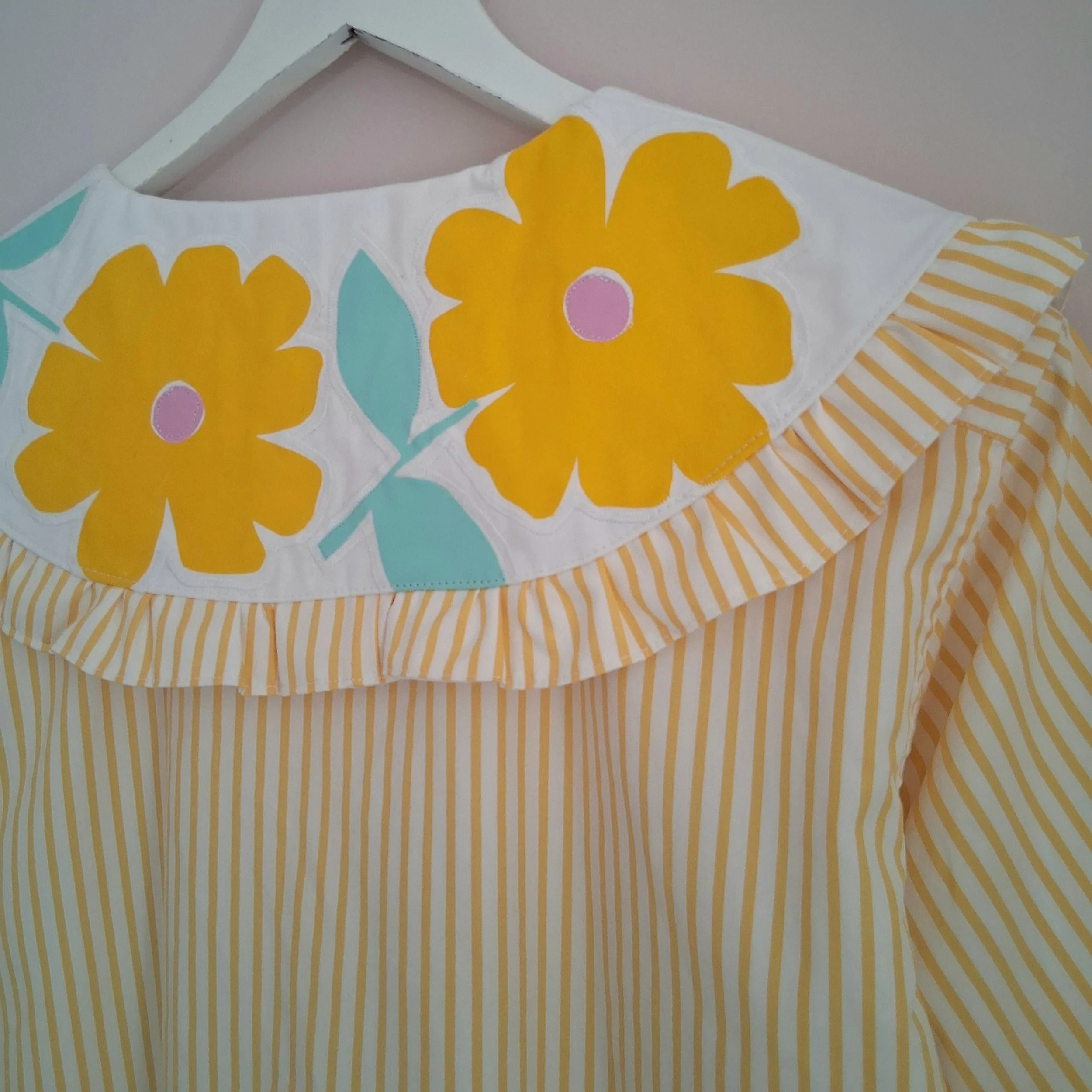This piece has been reworked from a second hand shirt and home textiles, along with hand screen printed designs, so every part of the garment is made using reclaimed textiles.