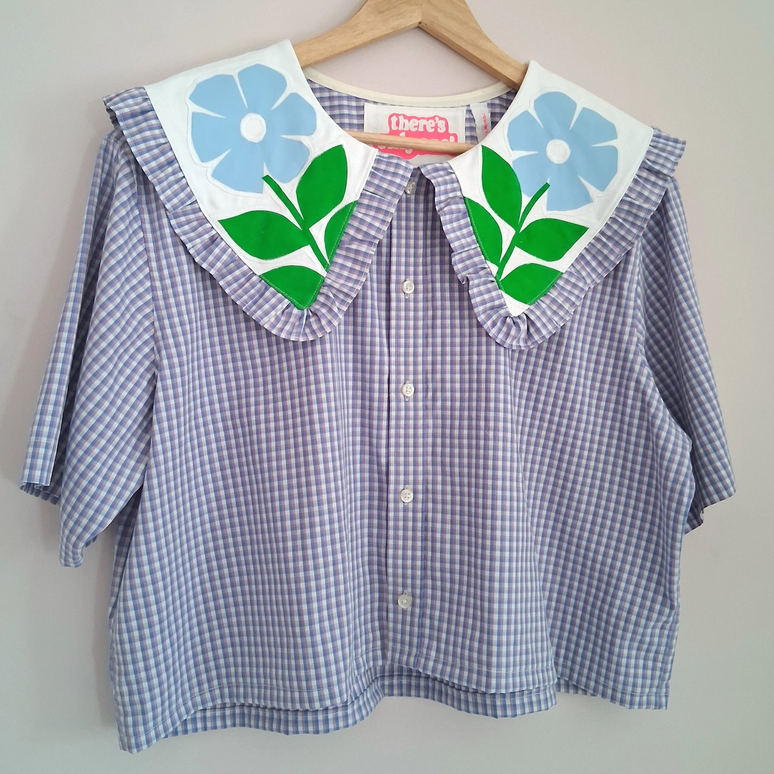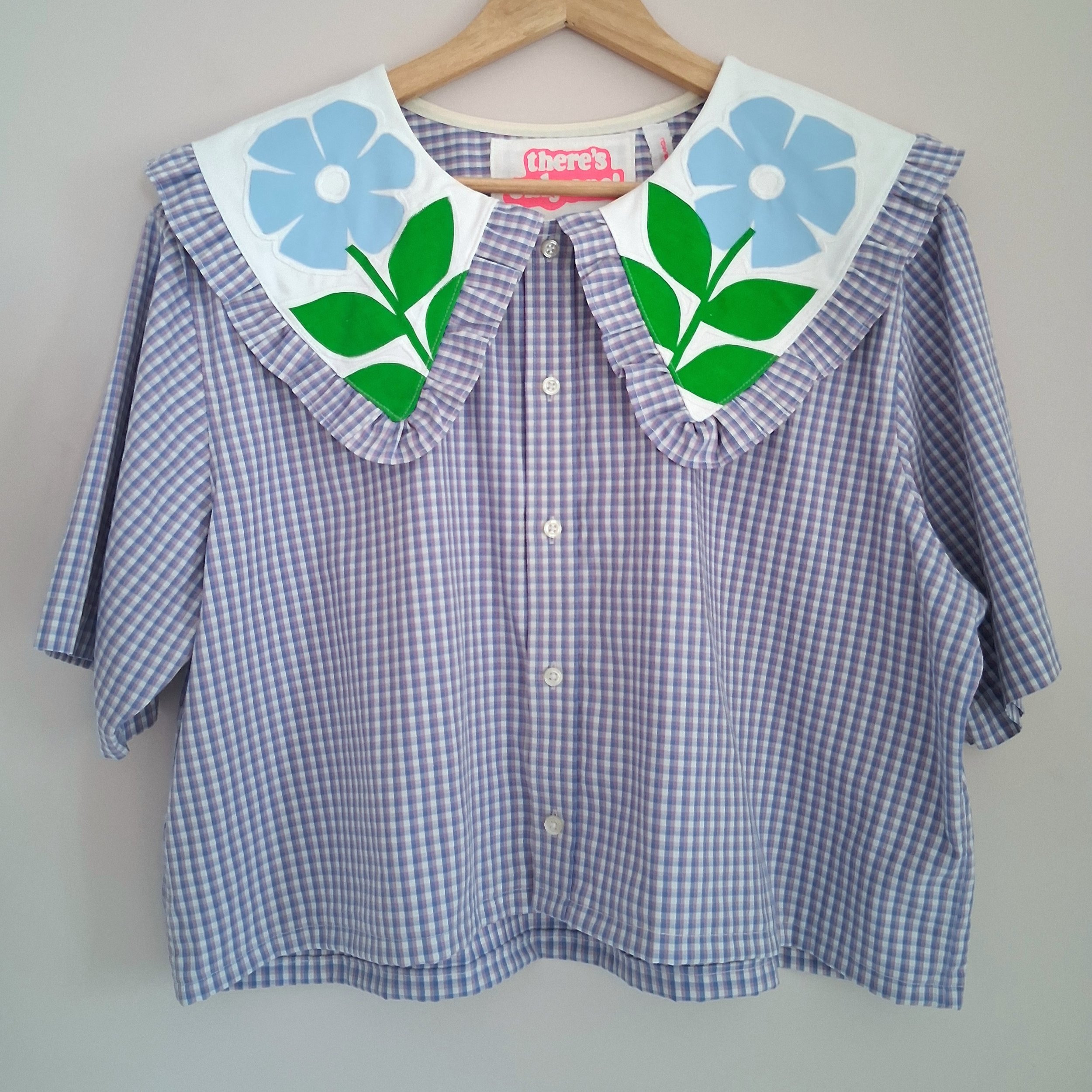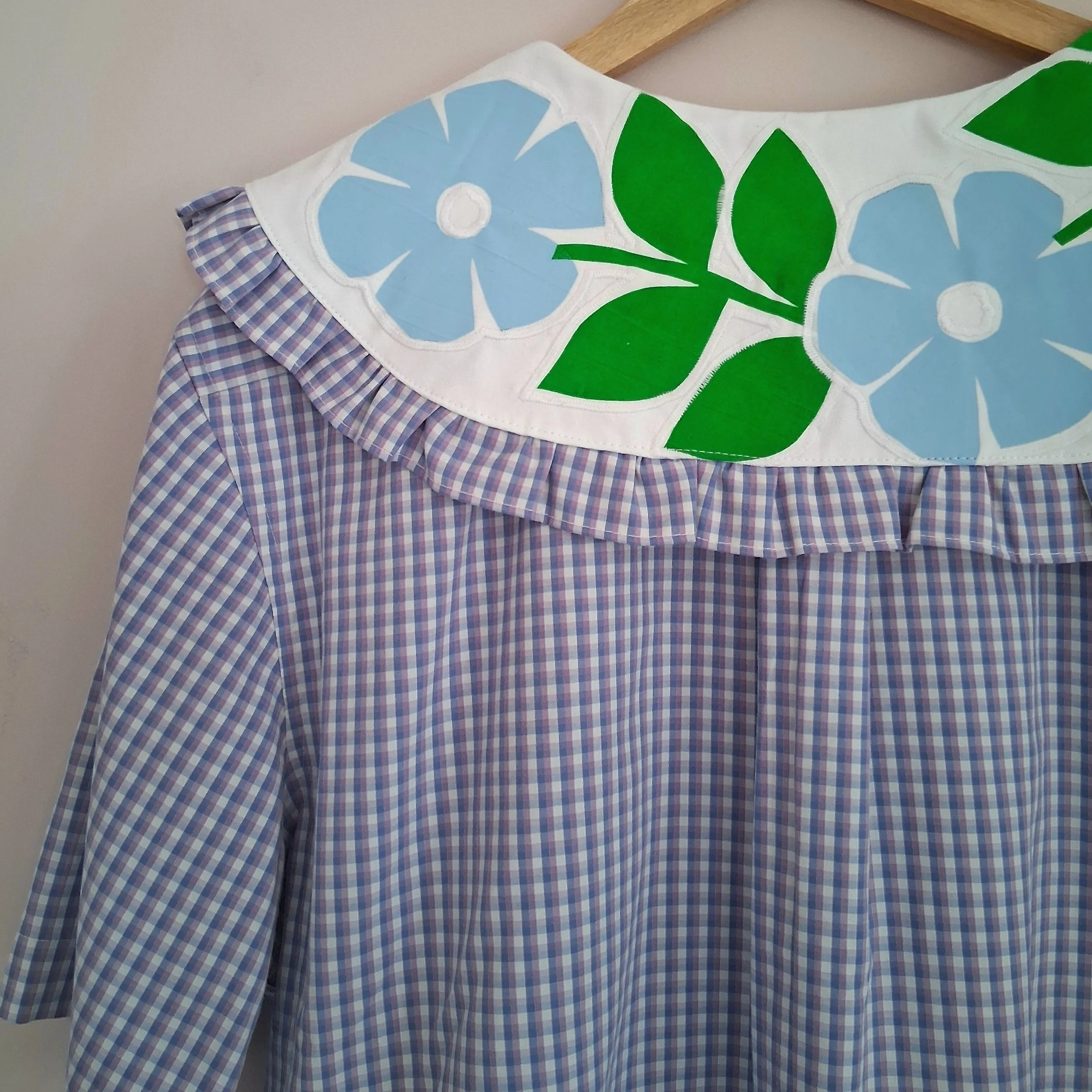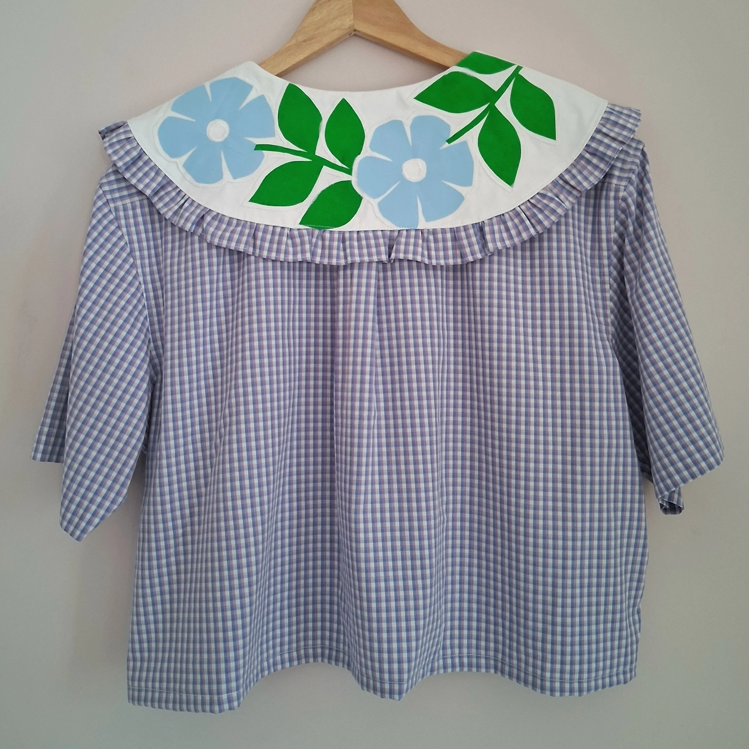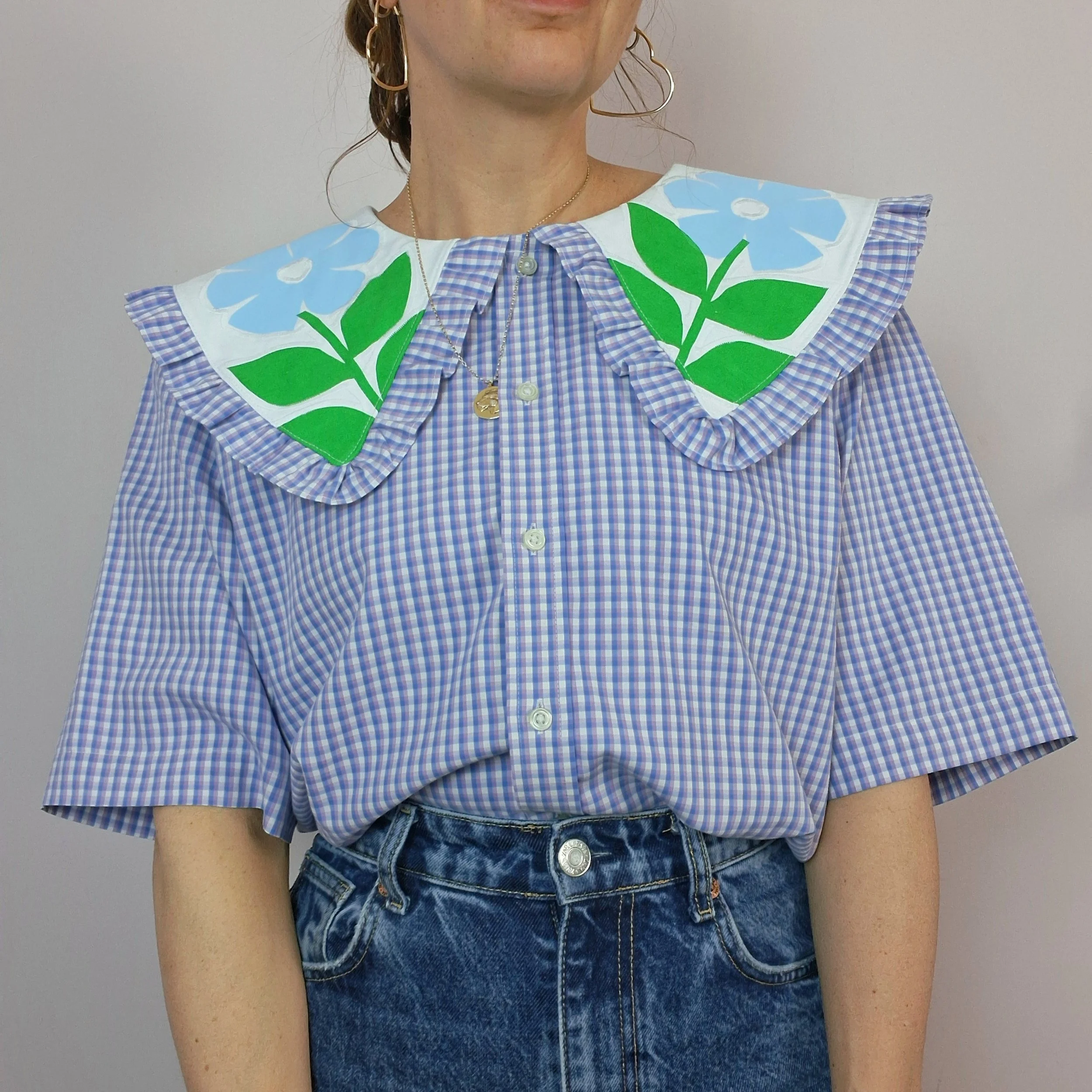 This piece has been reworked from a second hand shirt and home textiles, along with hand screen printed designs, so every part of the garment is made using reclaimed textiles.