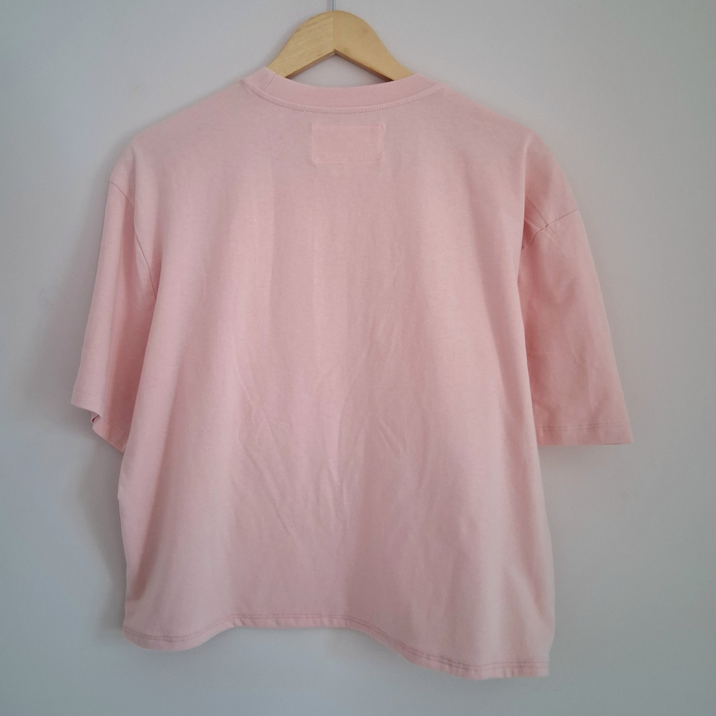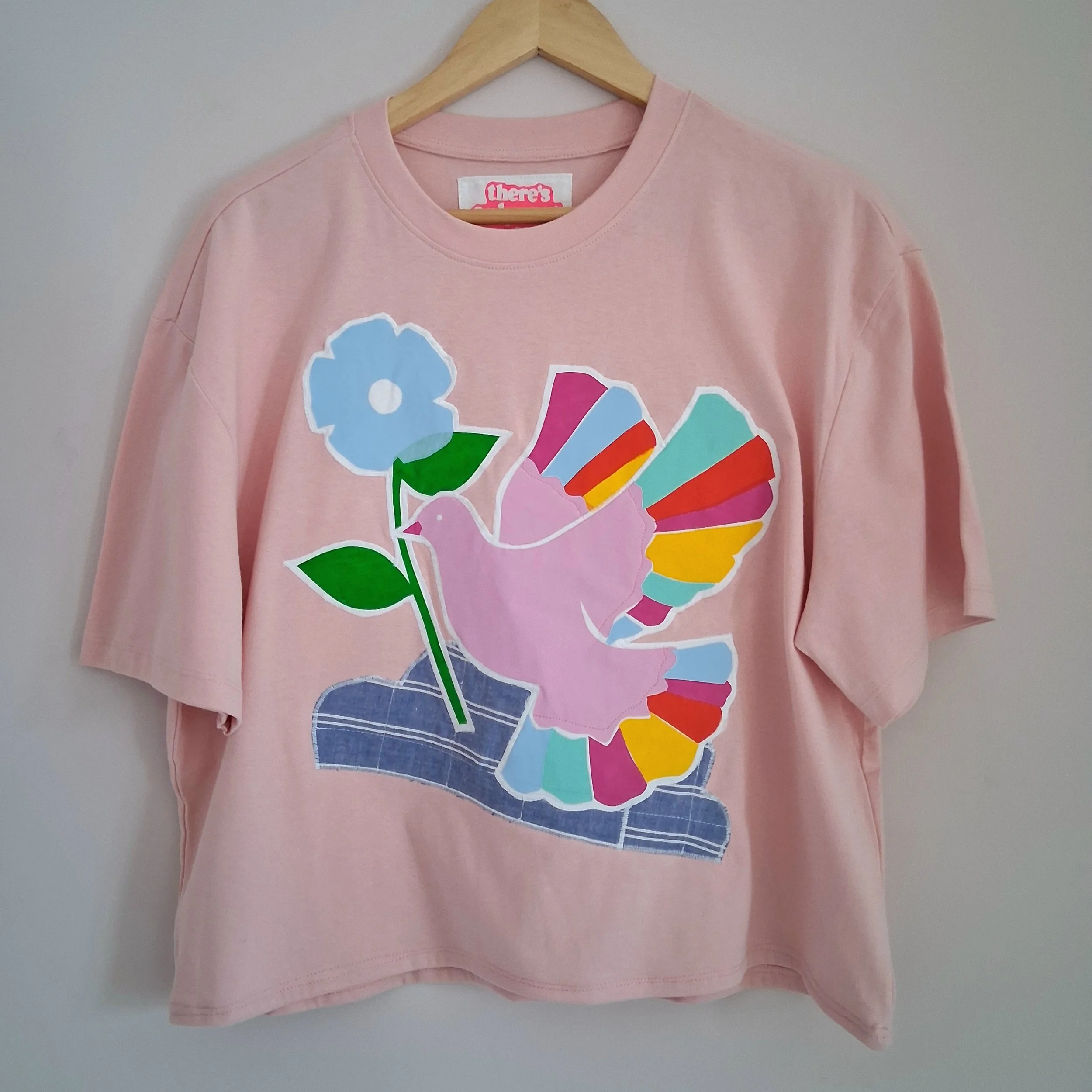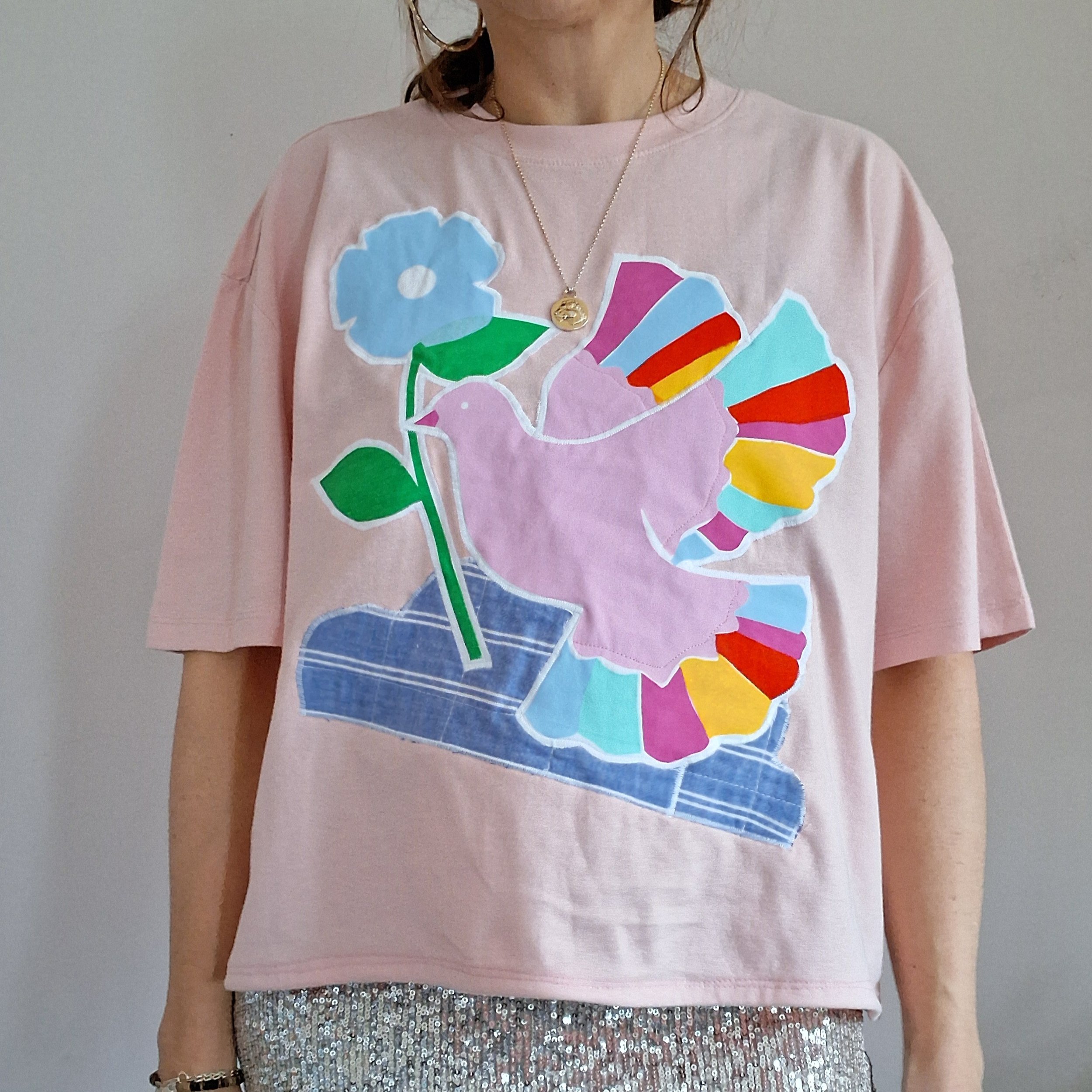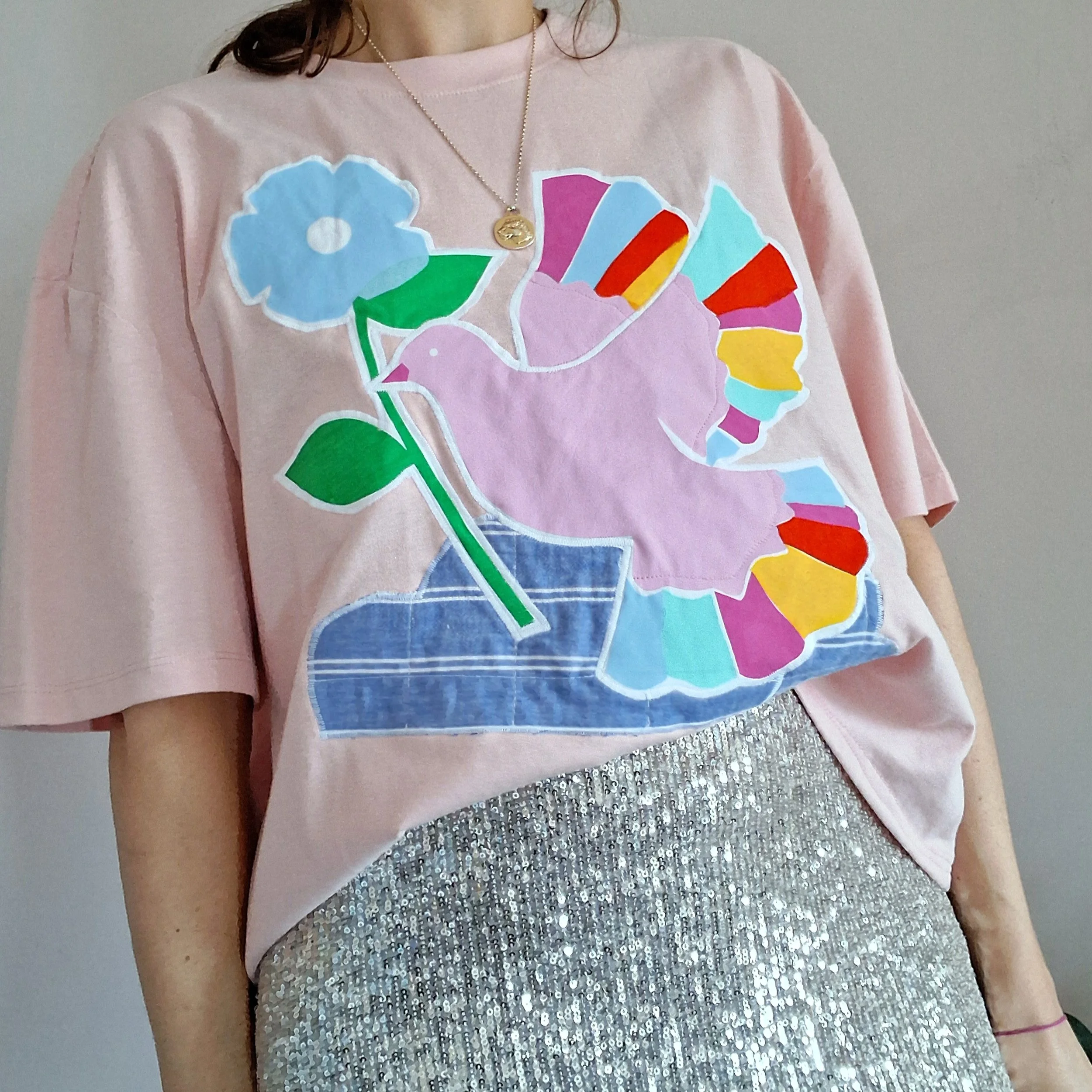 This second hand t shirt has been reworked with hand screen printed designs appliqued on to it. The appliqued designs have been printed onto second hand cotton. Every design is one of a kind, the aim being to turn a fast fashion, unloved item into a garment to be cared for and looked after.