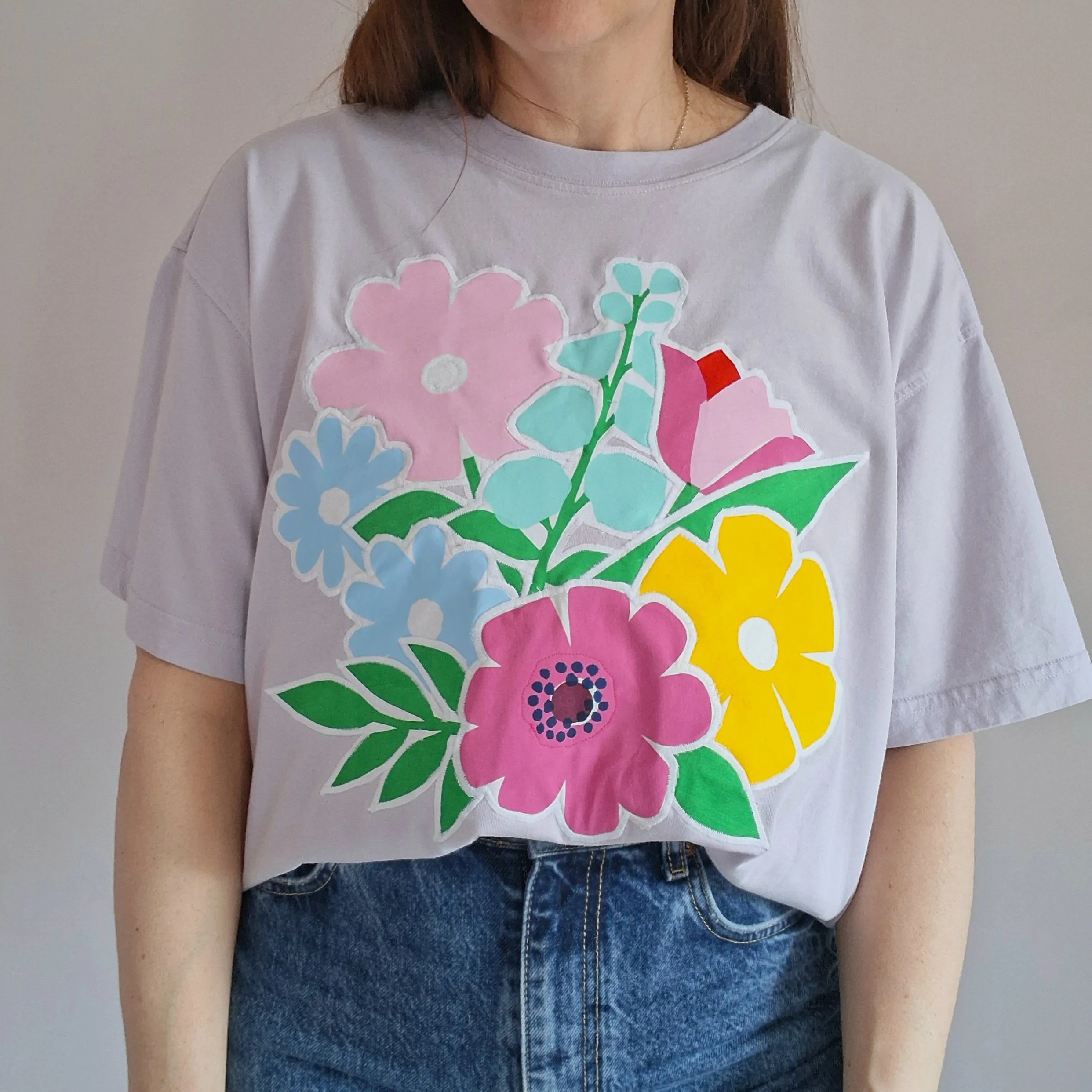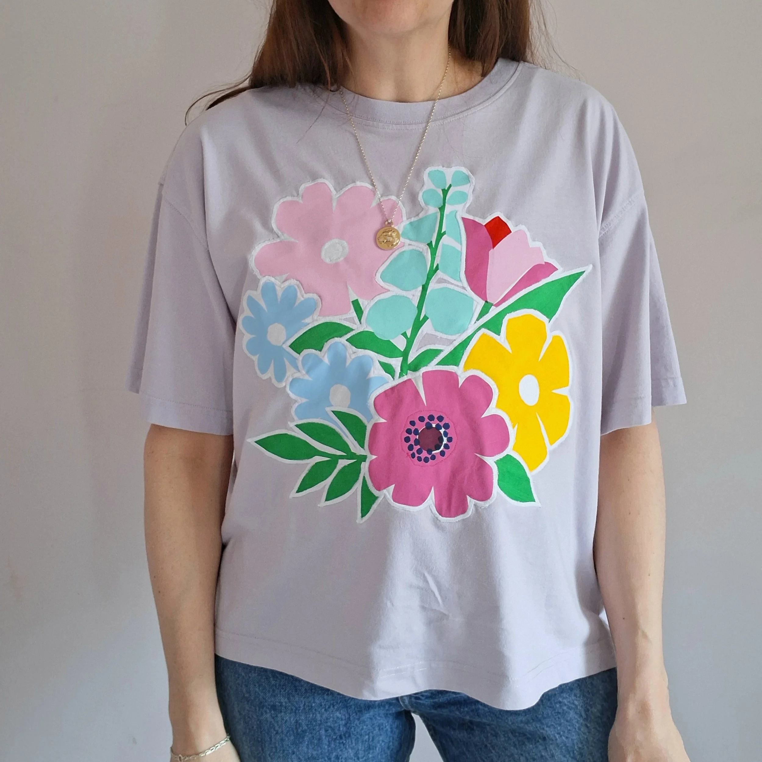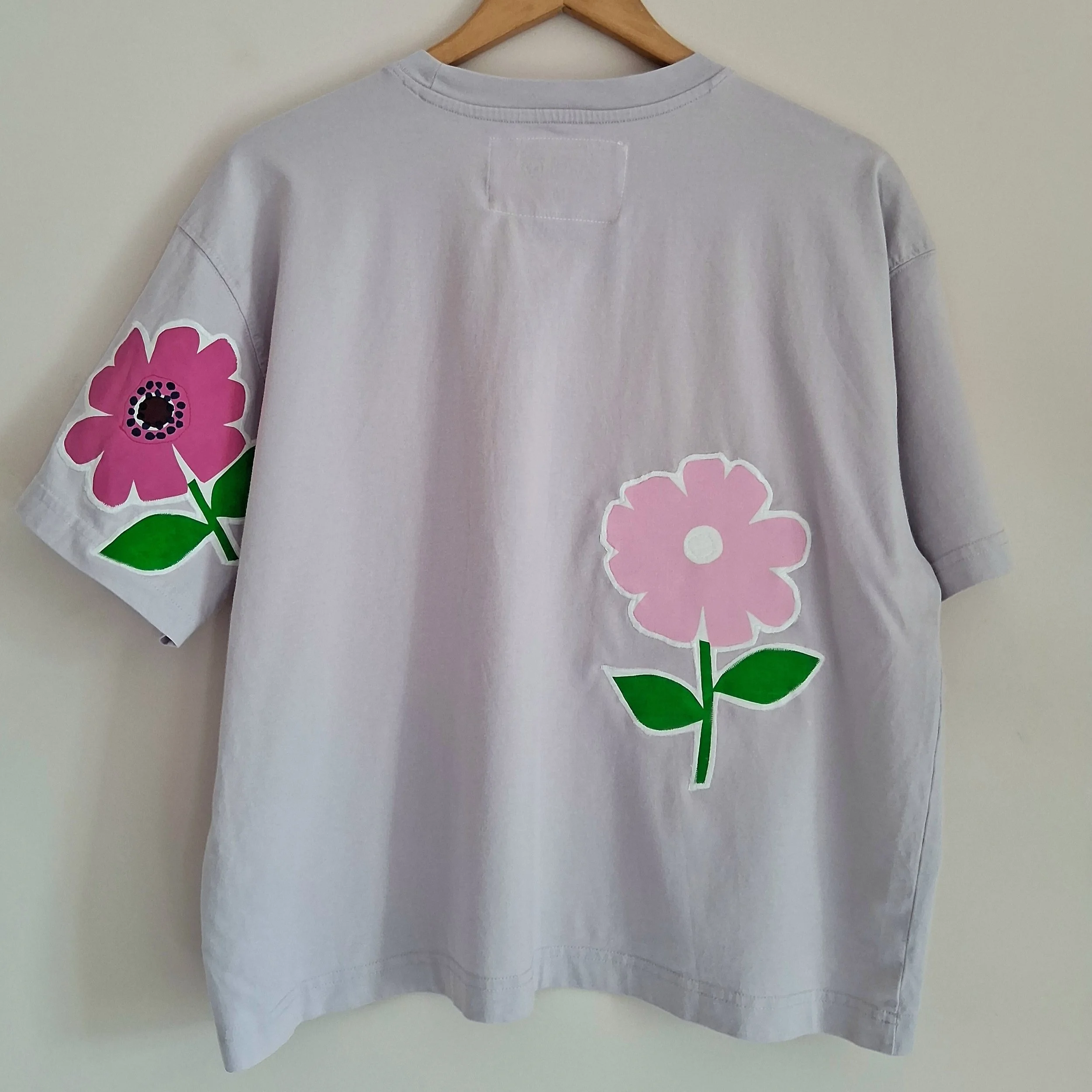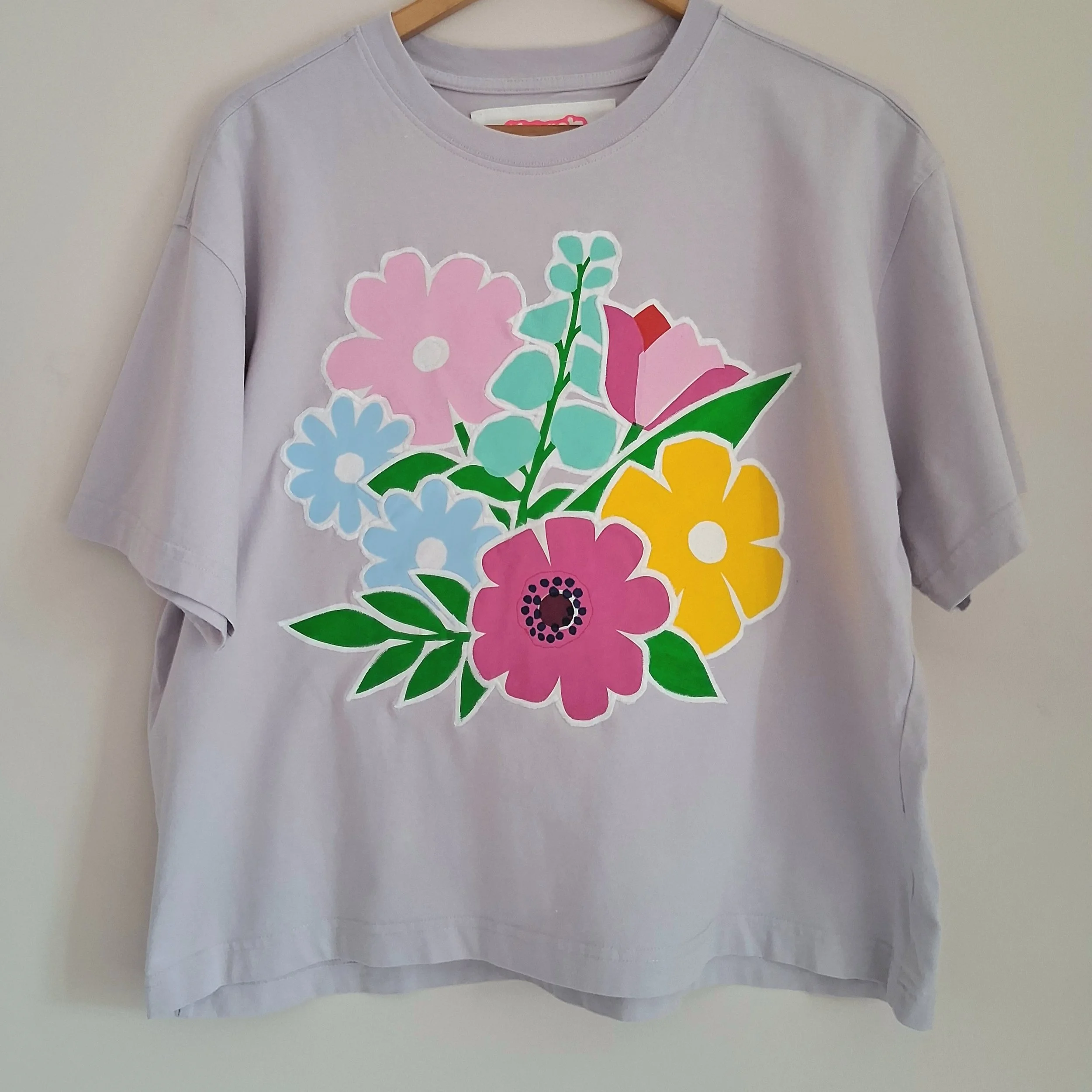 This piece has been reworked from a second hand t shirt, with hand screen printed designs on secondhand home textiles, so every part of the garment is made using reclaimed fabrics. The designs are appliqued on to each garment.