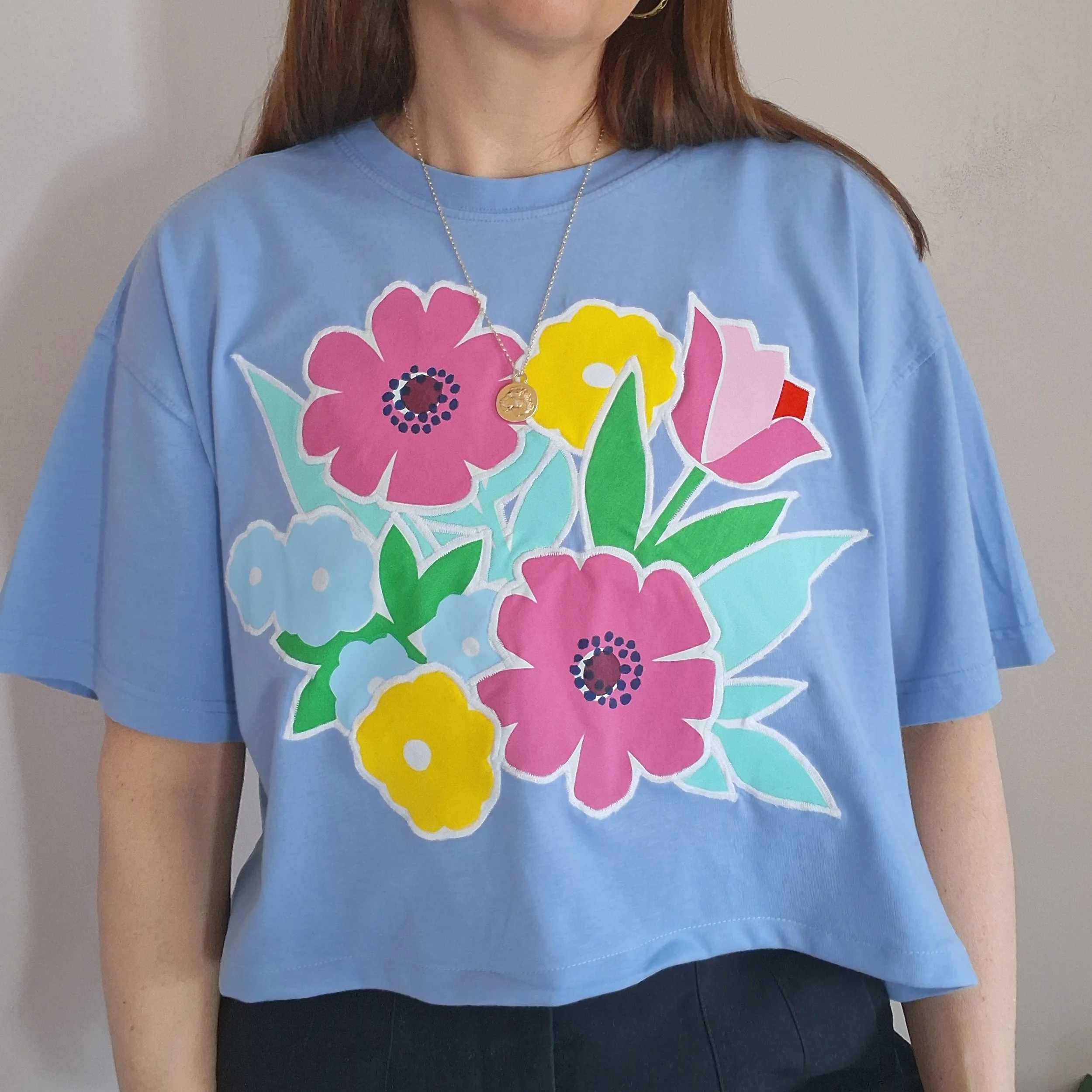 This piece has been reworked from a second hand t shirt, with hand screen printed designs on secondhand home textiles, so every part of the garment is made using reclaimed fabrics.